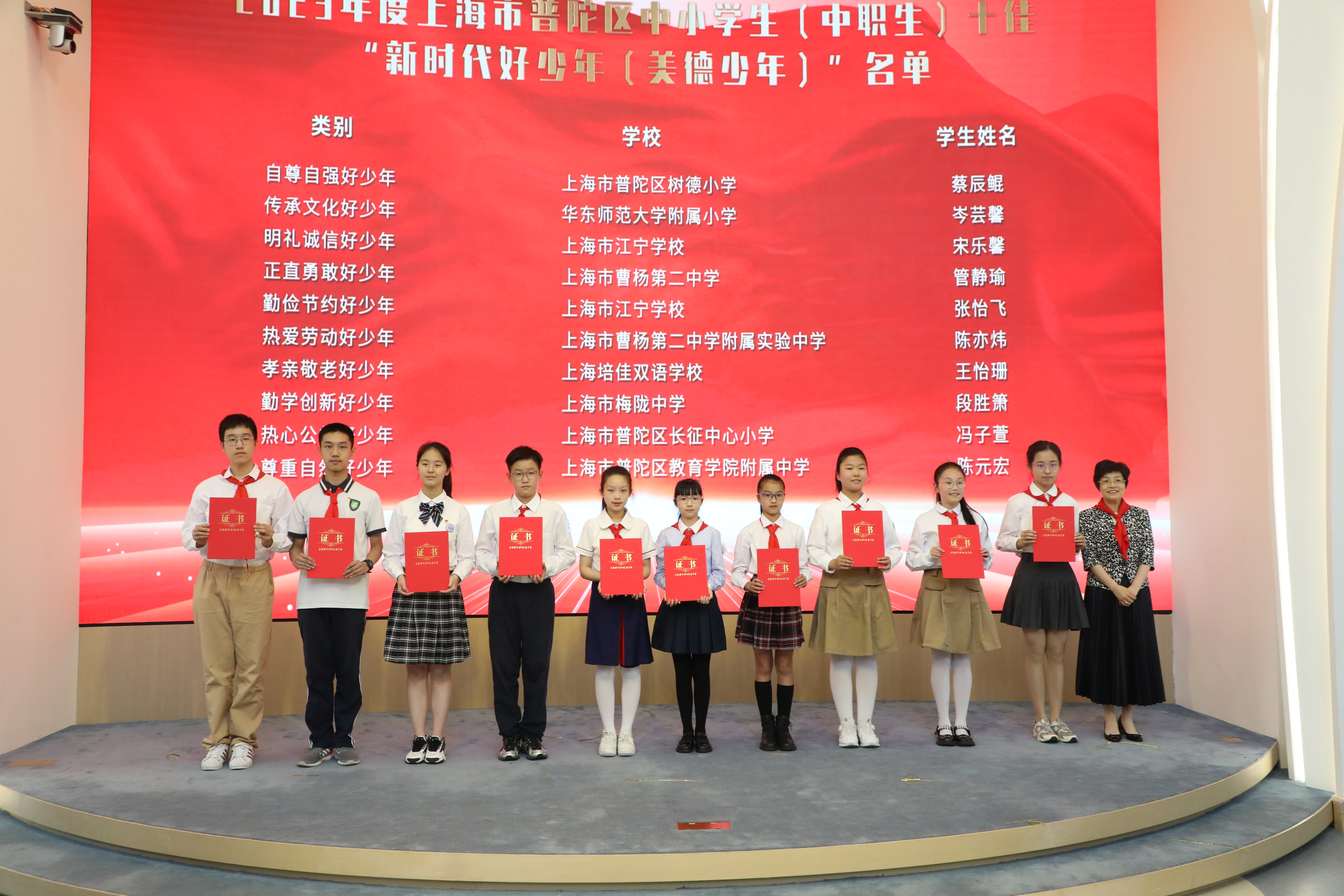 为2023年度普陀区中小学生(中职生)十佳“新时代好少年”代表颁发证书