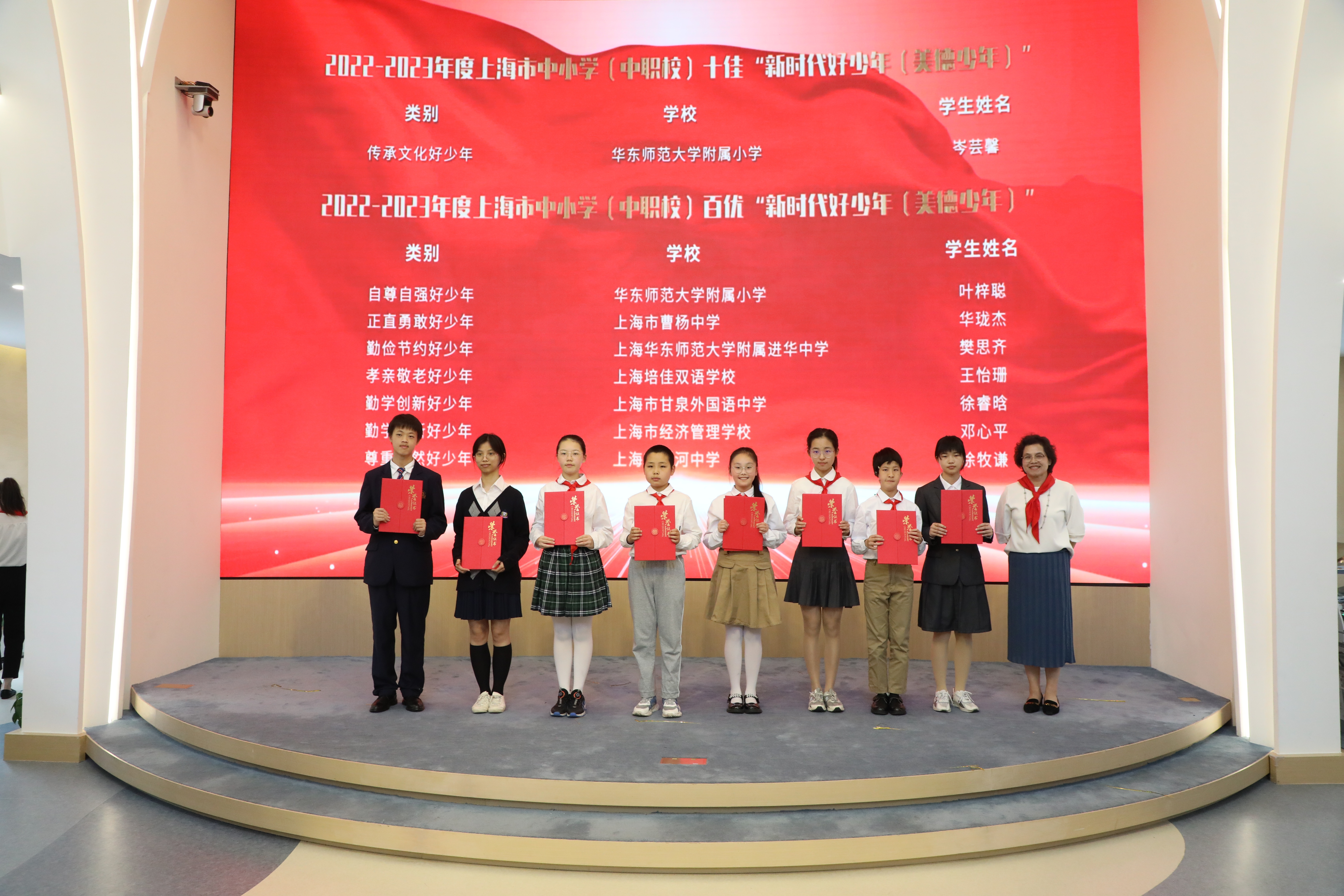 为2022-2023年度上海市中小学(中职校)十佳“新时代好少年”、2022-2023年度上海市中小学(中职校)百优“新时代好少年”代表颁发证书