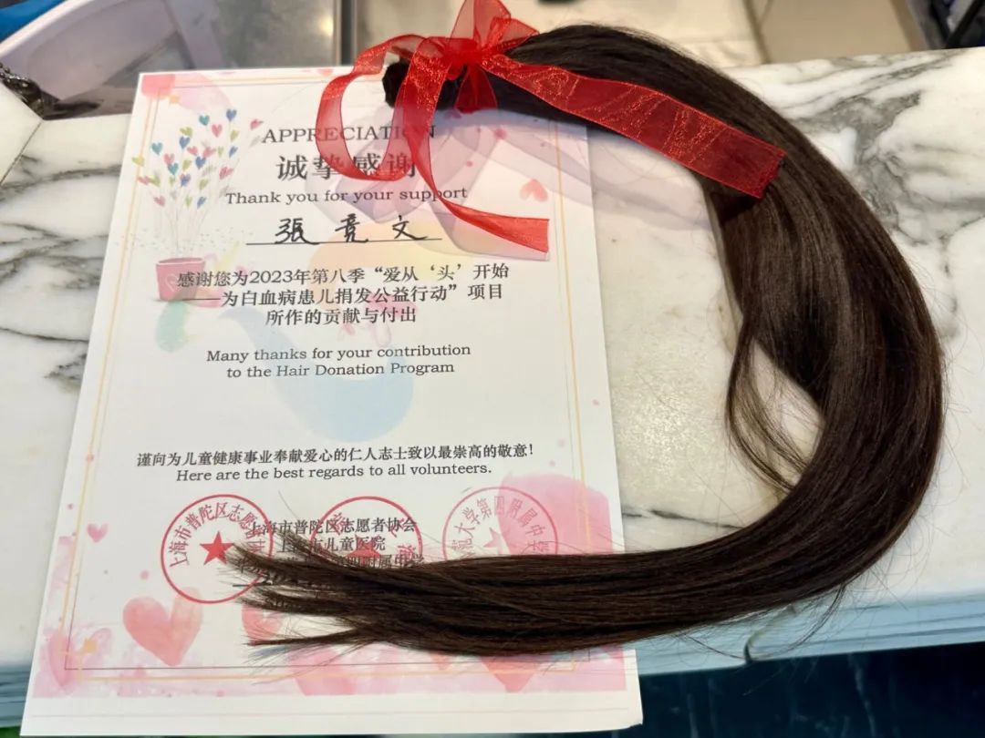原来,张竞文之所以会萌生捐发想法,学习的榜样正是母亲杨敏。去年八月,杨敏在了解到这一公益项目后,率先捐赠出自己蓄了多年的长发。看到母亲因捐赠头发获得的荣誉证书后,张竞文很是羡慕,于是杨敏趁机给女儿认真讲述了长发的用处和捐发的意义,这让张竞文也下定决心帮助失发的白血病患儿。因此,在她年满十周岁,符合头发捐赠要求后,便毫不犹豫地赶来捐发。