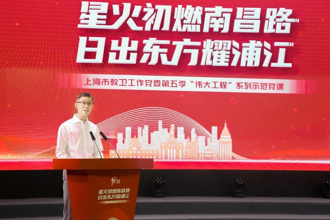 教育者先受教育,铸魂者先铸其魂。每一次党课,都是一次淬炼。上怎样的党课?怎样上好一堂党课?黄浦区教育党工委书记陈亮用三个关键词导入课程。第一个关键词:转化,打造有格局的党课。创造性转化区域深厚的红色文化底蕴资源,着力营造可见、可触、可感的红色历史场景,在更大场域、更长历史轴上进行时空对话。第二个关键词:融合,打造有内涵的党课。党课有了说服力、吸引力和感召力,才能有生命力。我们坚持党团队一体化协同推进、坚持“情”“境”交融、坚持“大”“小”衔接,坚持守正创新、深度融合。第三个关键词:传承,打造有情怀的党课。百年来,中国共产党砥砺前行矢志不渝,从热血报国的烈士校友,到新时代以时代楷模吴蓉瑾为代表的优秀教师们,我们始终牢记“国之大者”,坚持为党育人、为国育才,这正是真理与信仰的代代相传。