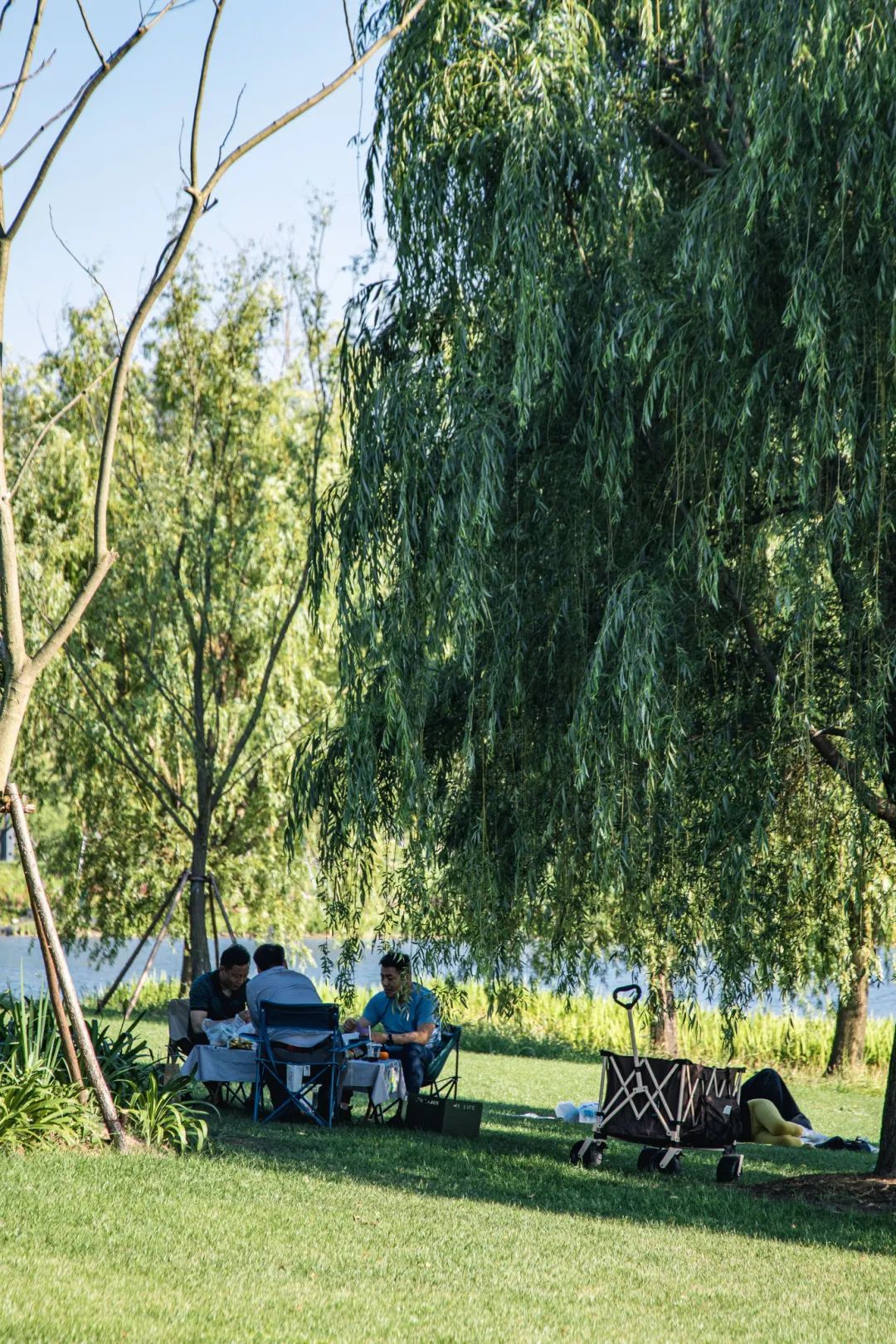 世博文化公园的湖边草坪非常绿,宽敞而开阔,既可远眺双子山,又可以欣赏湖泊和十一孔桥。