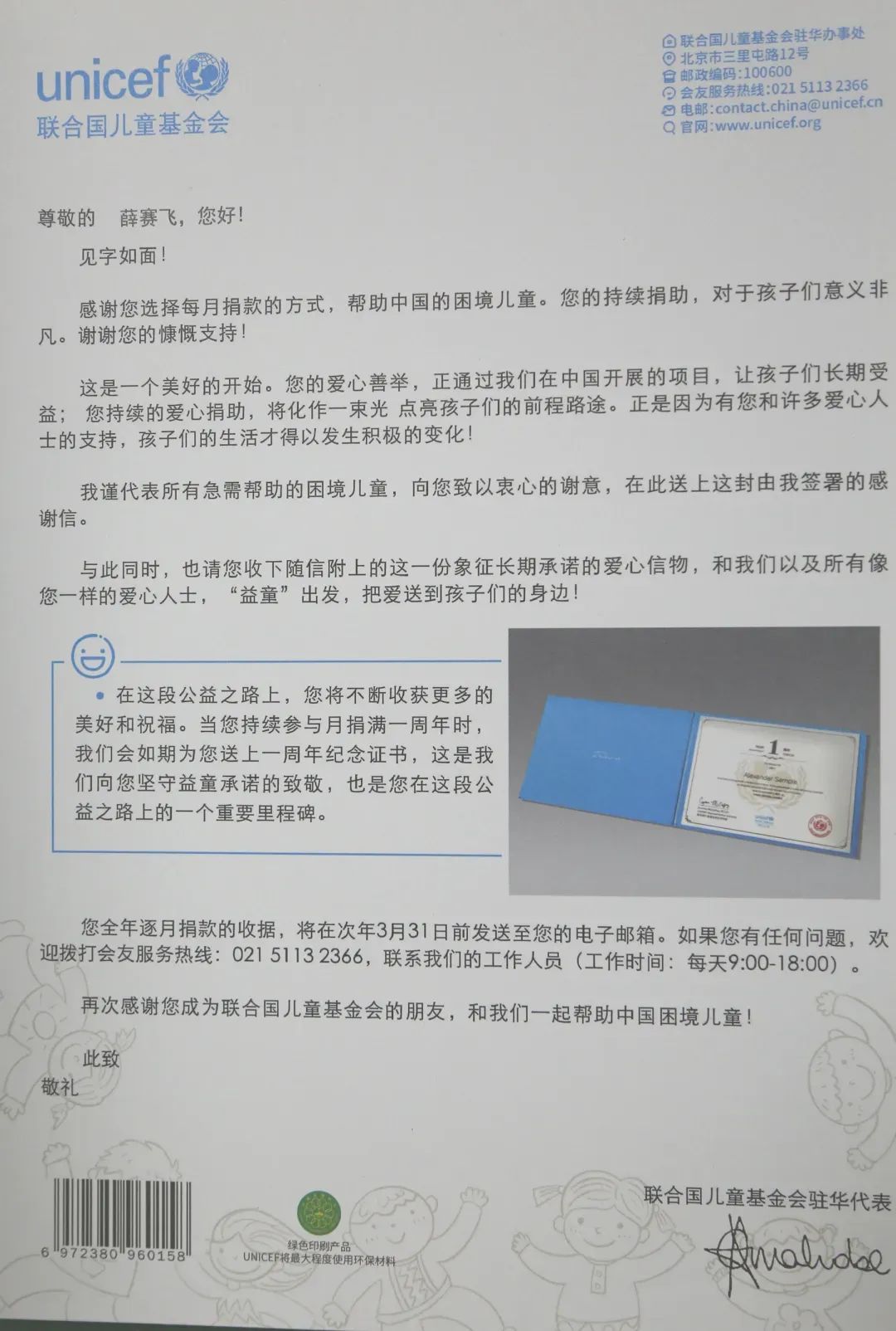 一封来自联合国儿童基金会的感谢信寄到
