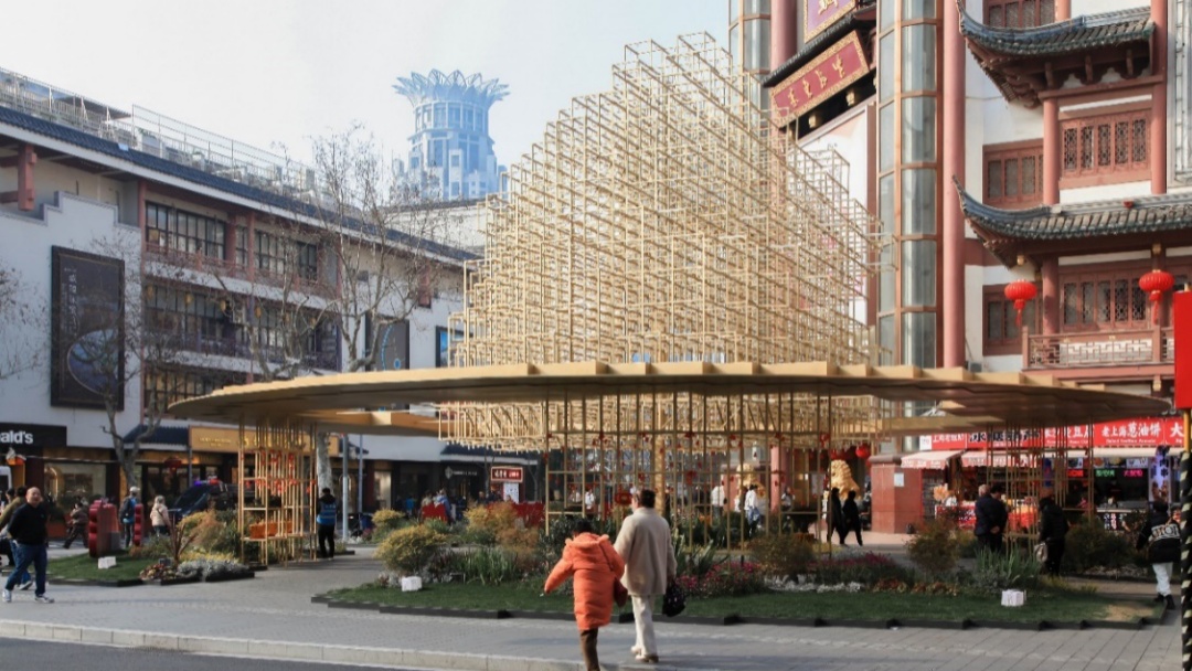 空间界面的打造,提取了三点福佑地区的色彩印象:“金玉,黛水,园绿”,分别对应建筑界面,道路铺地和街边绿化。对福佑、福民商厦进行了外立面尤其是近人尺度的改造,设计从传统建筑的檐口、斗拱提取元素加以抽象,并用现代的材料和元素来进行演绎。