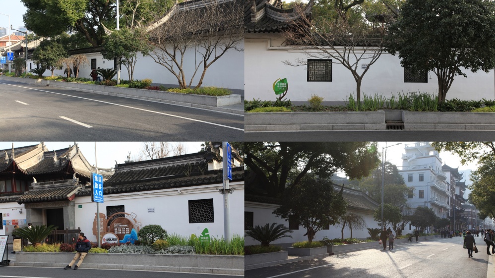 在路面铺装上采用深色的仿石砖提示福佑路过去作为黑桥浜的历史,并且在人行道上镶嵌带有福字的石板。街边绿化的打造更多考虑豫园的古典园林手法及其对周边道路的透绿作用,将之应用到街道上。