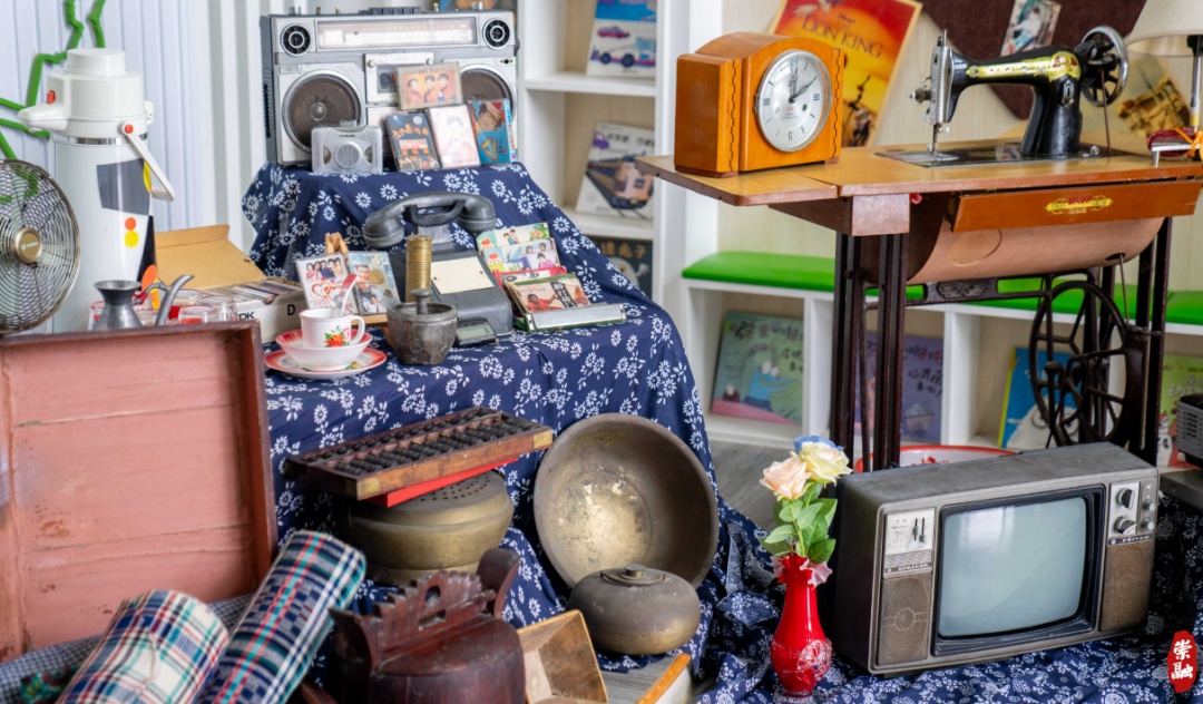两周前,育英幼儿园就开始向各家庭征集崇明老物件,家长们积极加入,纷纷把家里“压箱底”的宝贝贡献出来,有老电视机、磁带、缝纫机、升斗……“我们将收集到的老物件布置成怀旧复古风背景,为孩子们打造了这场独一无二的复古游园会。”育英幼儿园的一名教师说。