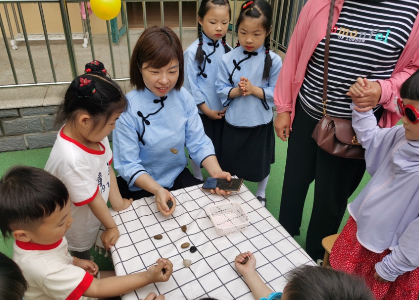 活动现场,“大朋友”和小朋友一起踢毽子、拍洋片、斗鸡、滚铁环、跳房子、打弹珠、跳皮筋……玩得不亦乐乎。