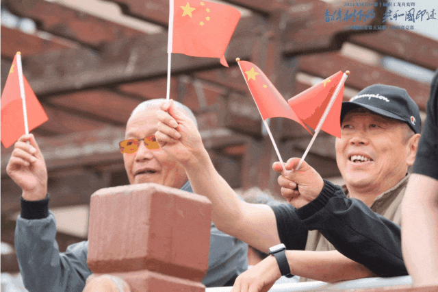“加油!加油!”岸上周边居民区居民们也摇旗呐喊,为龙舟队员鼓劲助威。