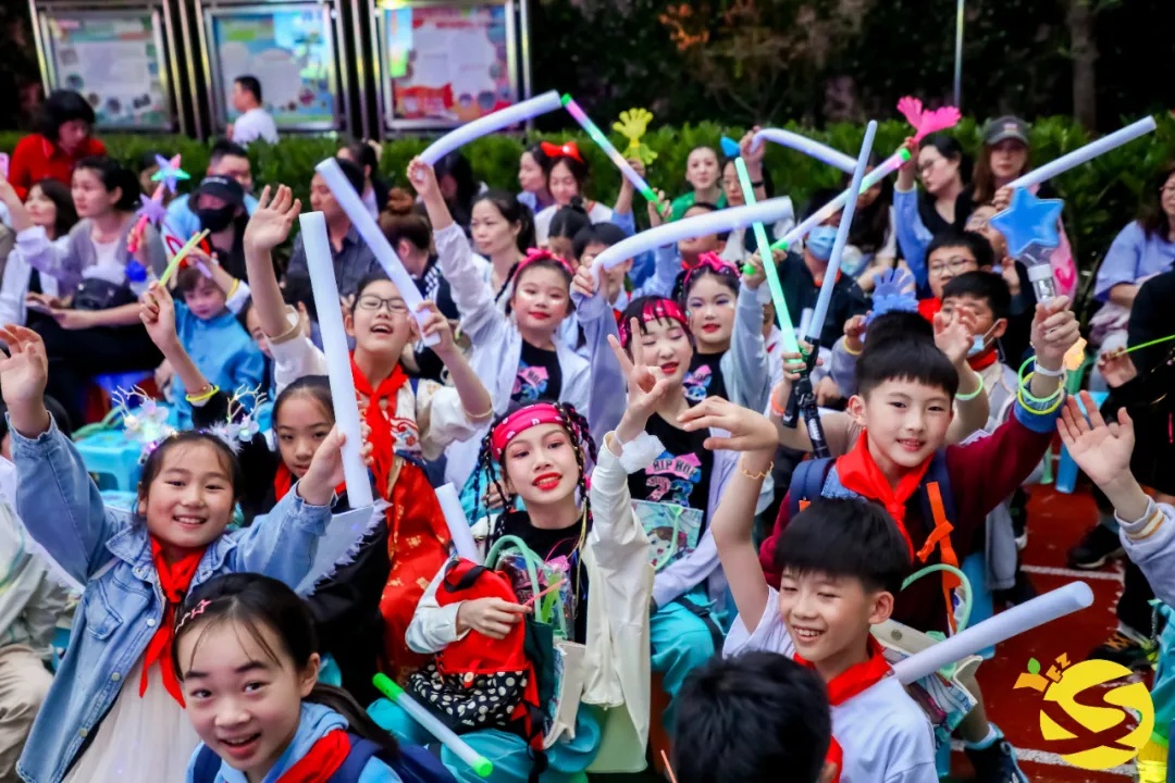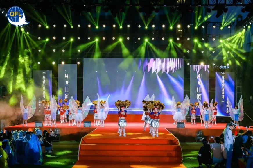 当天晚上,“六一”庆典晚会在操场上拉开帷幕。晚会分为五个篇章,分别以“AI山河”“AI祖国”“AI经典”“AI时代”“AI世界”为主题。5个年级、30个班级、1300余名学生全员参与,载歌载舞,致敬经典,礼赞时代,展望未来。