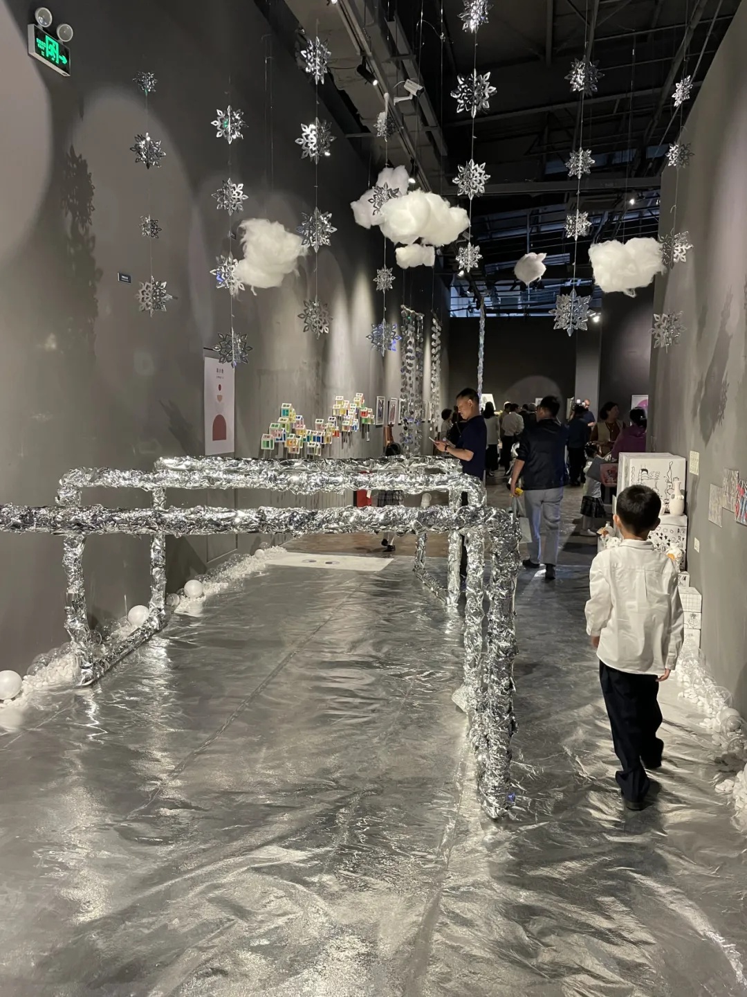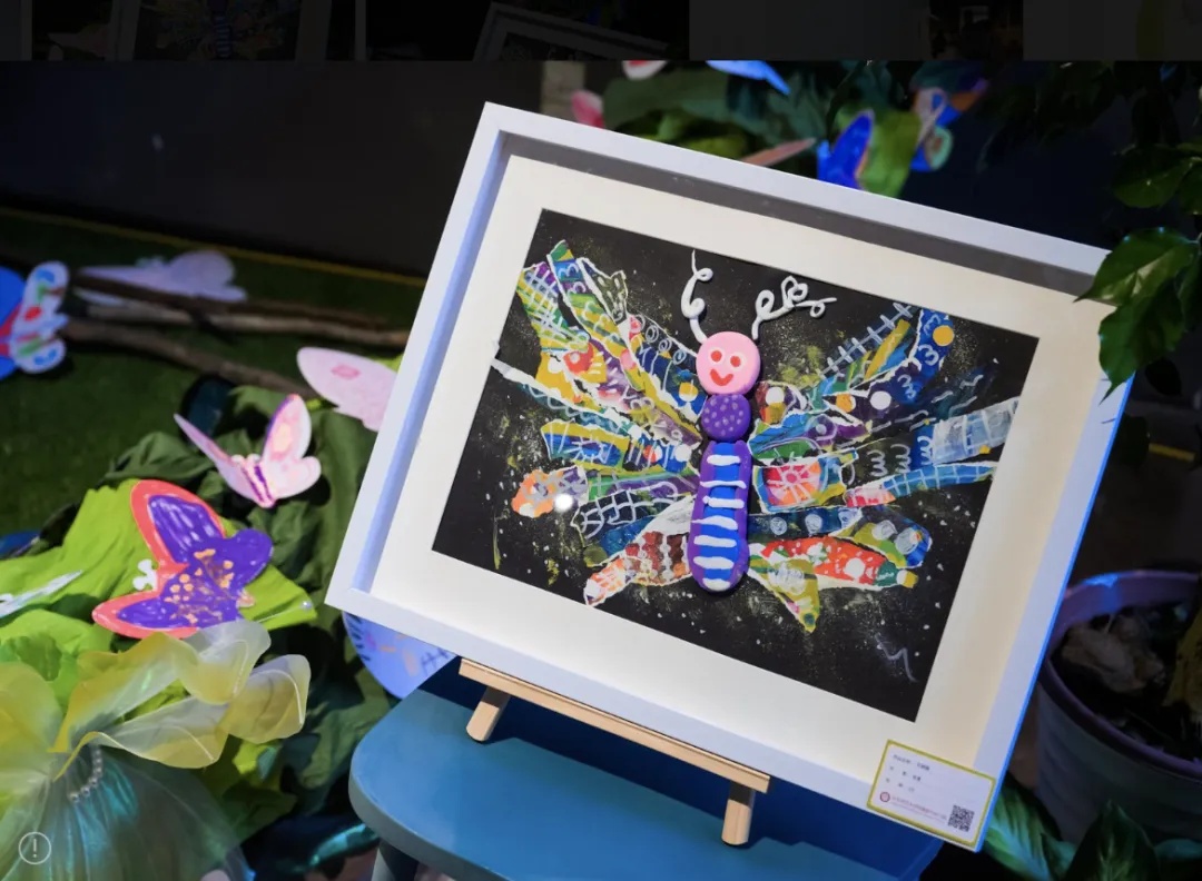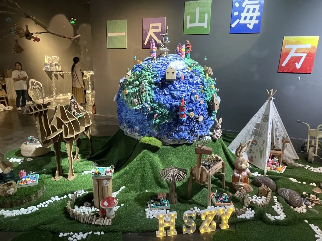 当华师紫幼的孩子们看着自己的作品被搬到美术馆里,都感到非常惊喜。现场可以看到,展览上不仅仅有画作展出,更有不少用生活中常见的材料搭建起来的装置。
