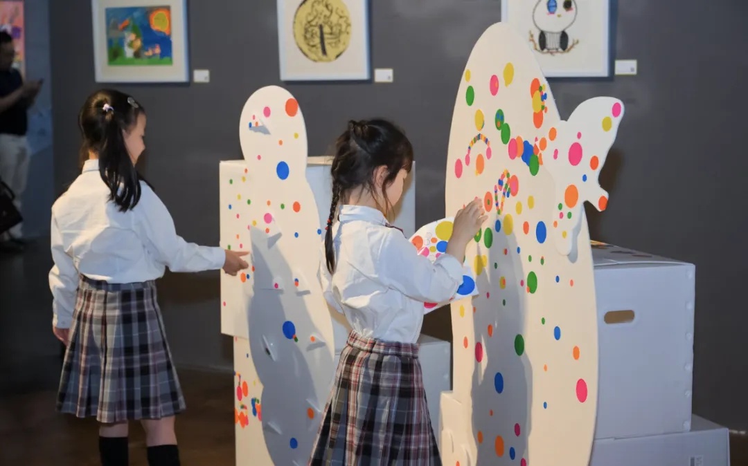 六一节,华东师范大学附属紫竹幼儿园为孩子们在一尺山海美术馆举办了一个画展,孩子们化身“小小策展人”,和老师们一起参与到了布展中。