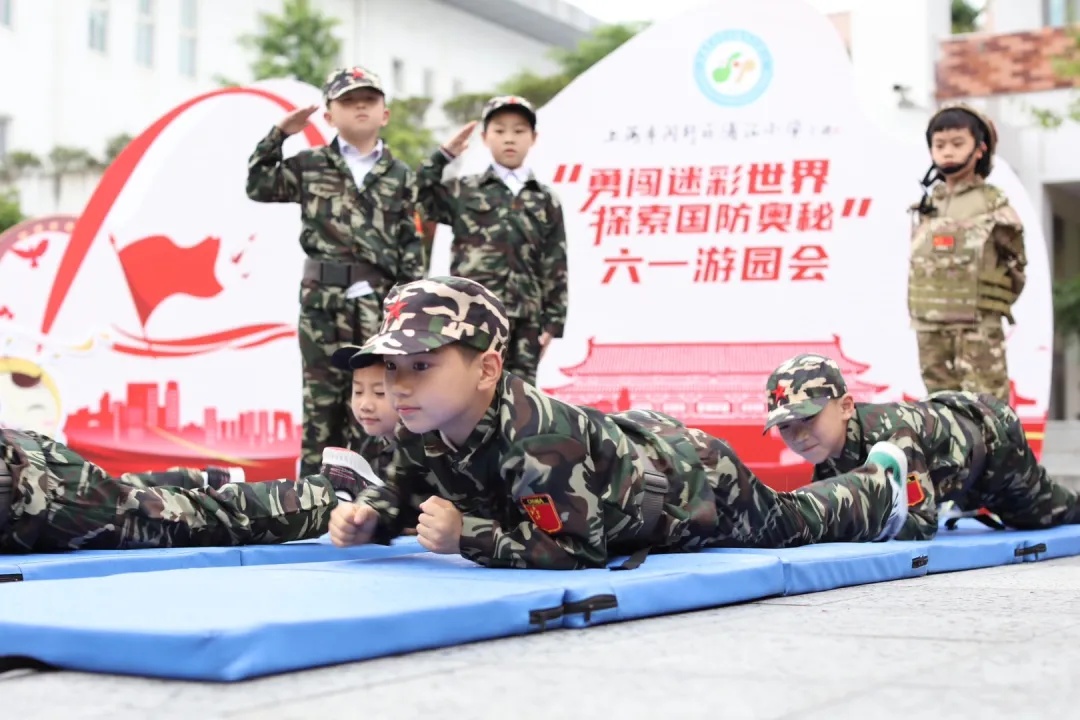 5月31日早晨,上海市闵行区浦汇小学的学生们身着迷彩服,跨越障碍物匍匐进校园,深入探索国防奥秘,感受迷彩世界的独特魅力。