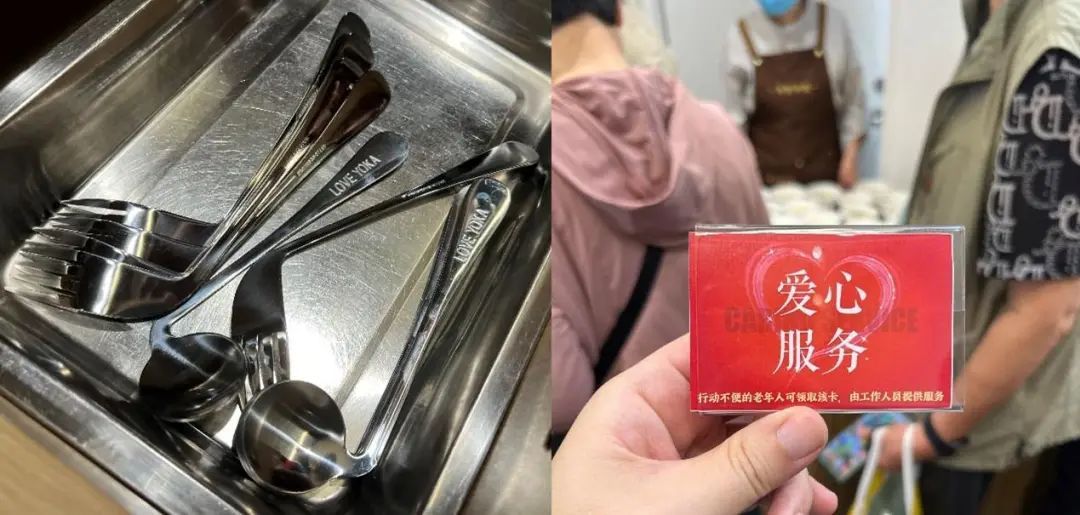 除了价格上的优惠,半淞园路街道社区长者食堂对于老年人的关爱还体现在细节中,对于腿脚不便的老年食客,工作人员会在其桌边放置“爱心服务”卡,为其倒水、送餐至餐桌;针对中风偏瘫老人,食堂还定制了定制餐具,以辅助这类人群正常用餐。