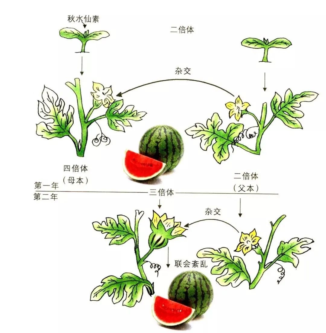 “三倍体”指的是它们的体细胞的染色体数是性细胞的3倍。相比之下,植物的体细胞通常只有性细胞的2倍,这种植物称为二倍体植物。只有染色体数为偶数的植物 (如2倍、4倍) 才能够产生种子,而无籽西瓜就是科学家们选育的三倍体植物。
