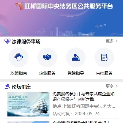 为进一步发挥法务区服务保障国际化中央商务区的核心功能,法务区历时半年多时间,打造了“虹桥国际中央法务区公共服务平台”。平台面向广大企业,将法务区优质的法律服务资源进行整合汇集,竭力为市场主体提供线上线下“一站式”法律服务。下面就让我们看看,它都有哪些功能吧!