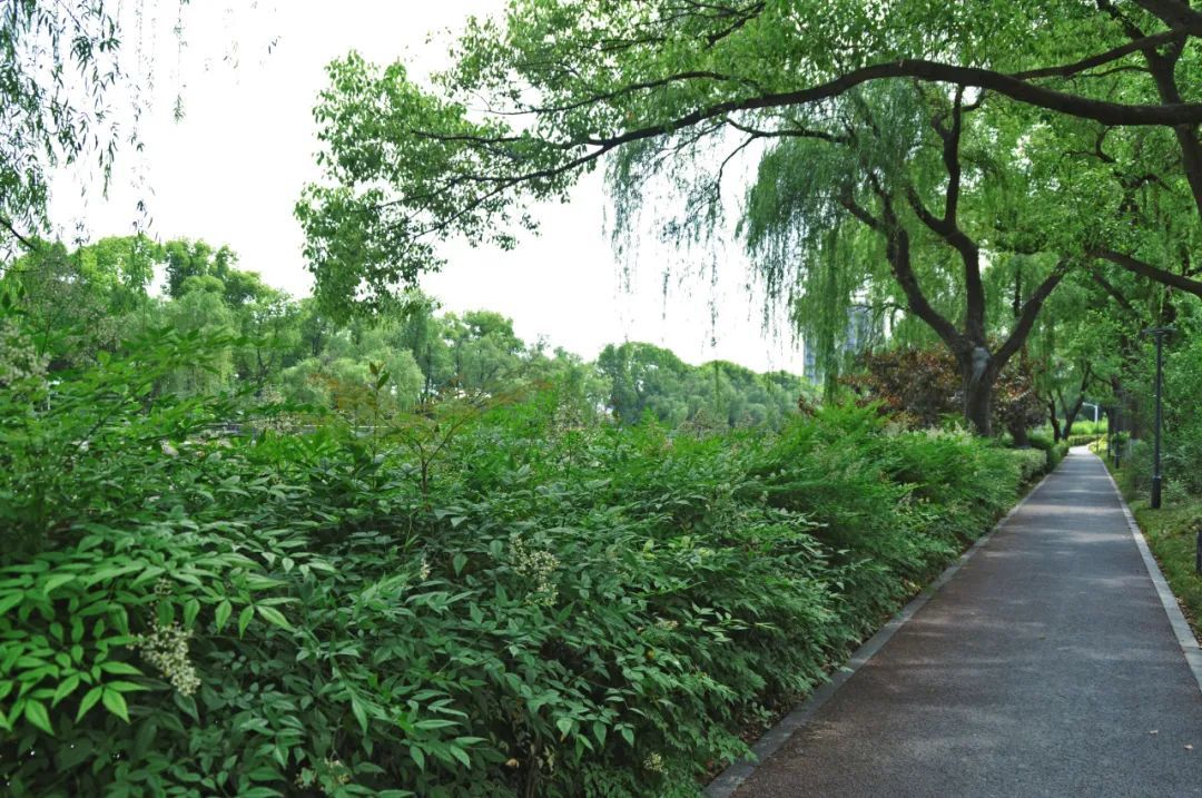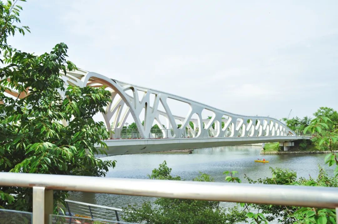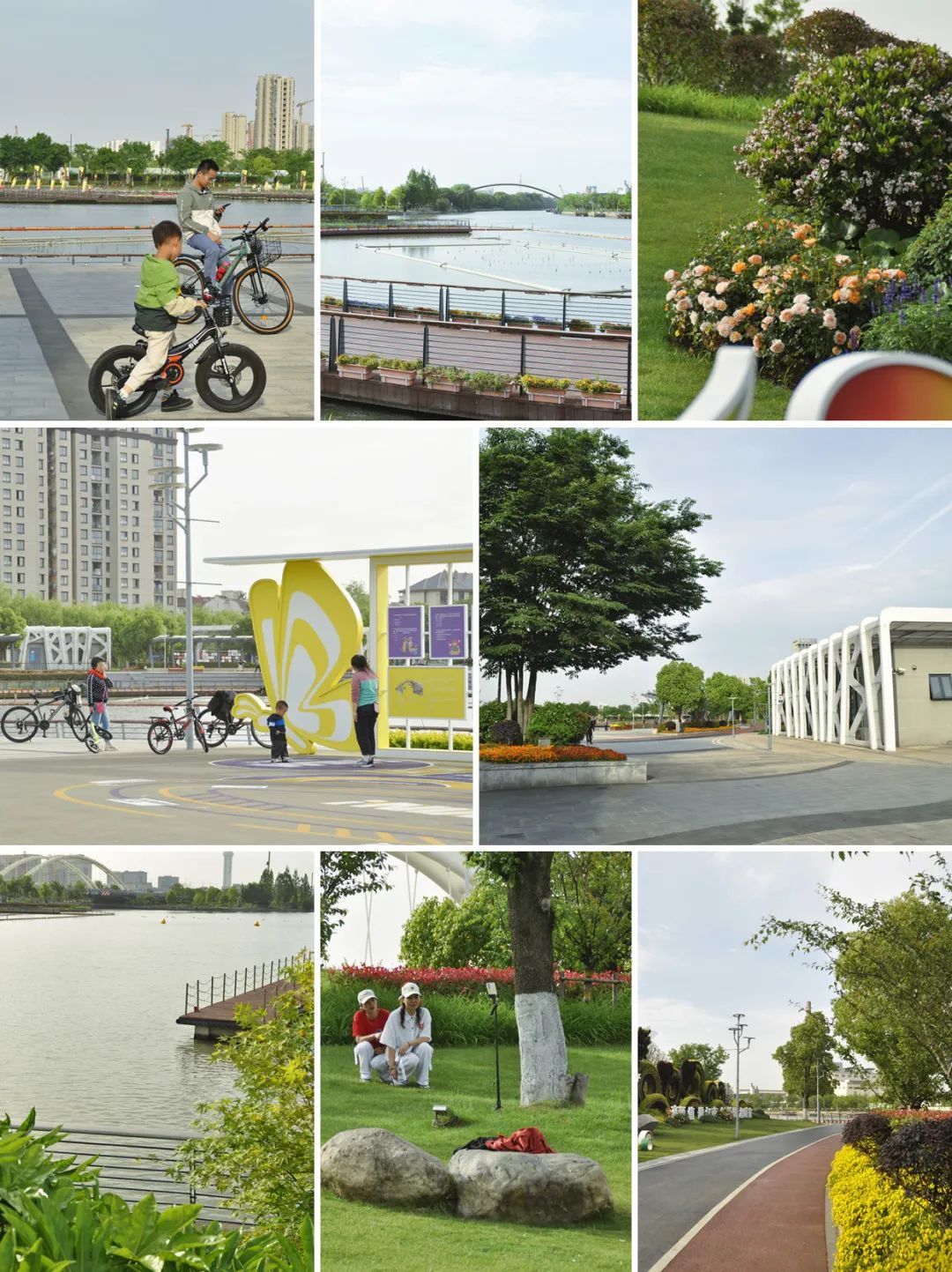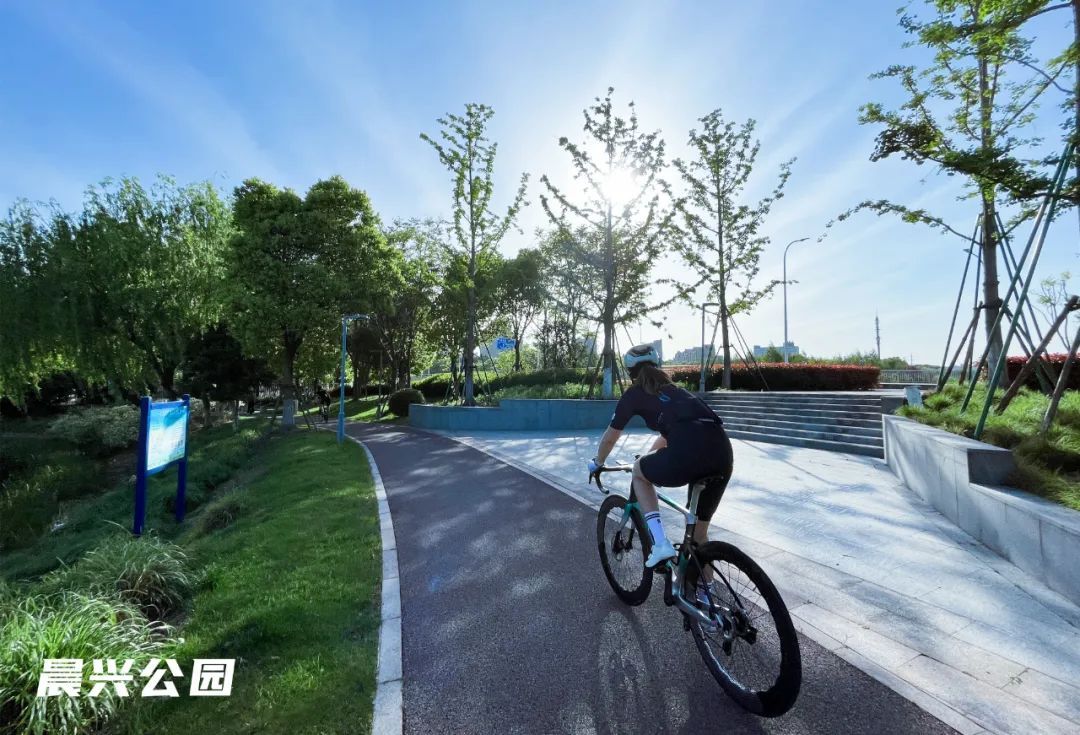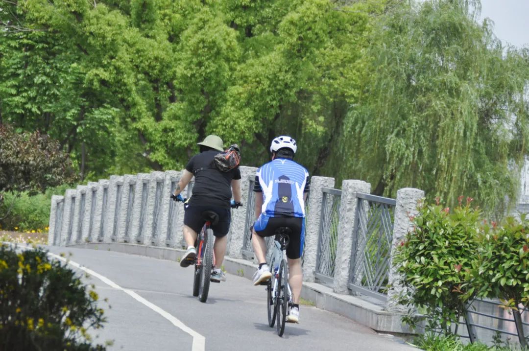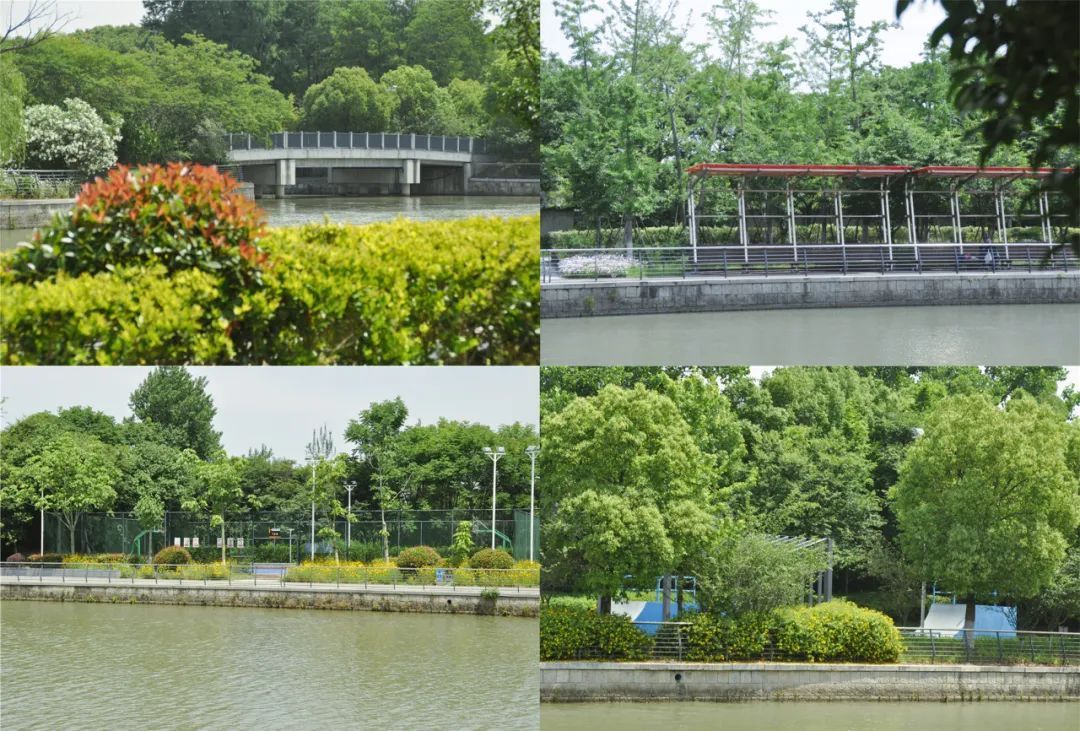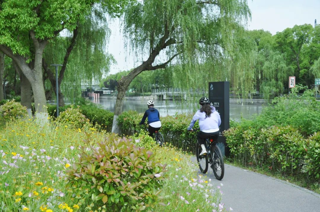 从胡渡浜人行桥出发,推车上云锦桥,先到长岛公园,在长岛驿站灌满水,然后,开启音乐,准备出发!沿着环城水系上达河段一直前行,滨河步行道、骑行道干净而整洁,岸边树木葳蕤、鲜花盛放、风景如画。