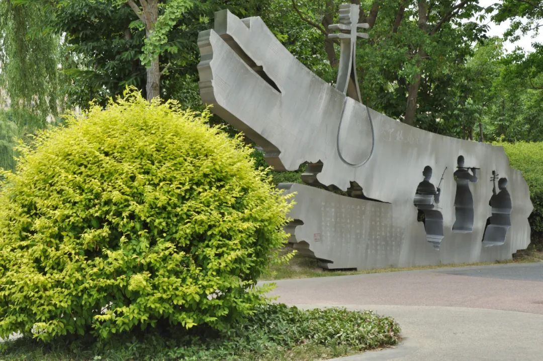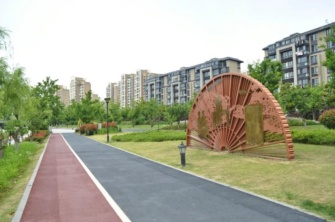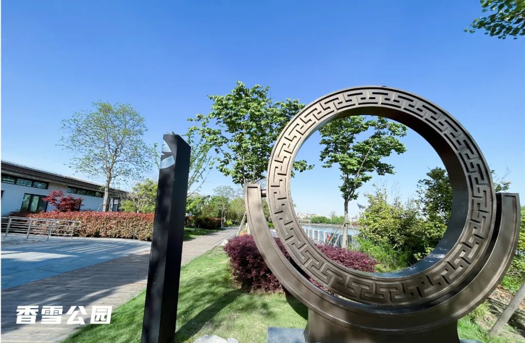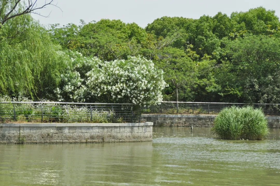 正值夏日,油墩港河畔,繁茂的夹竹桃正值盛花期,非常美丽;沿途种植的蜀葵也花开艳丽,迷人不已。相较来说,环城水系油墩港段距离较短,骑行依次经过映霞广场、观流广场、倚木广场,穿过沪青平公路,便可抵达怀古广场。(ps:如果你对崧泽遗址博物馆感兴趣,在此可以绕行去博物馆转一圈。)