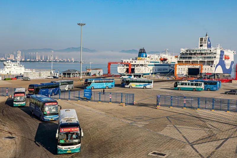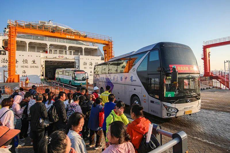 23辆旅游大巴陆续驶离威海港。威海日报记者 孙大伟 摄