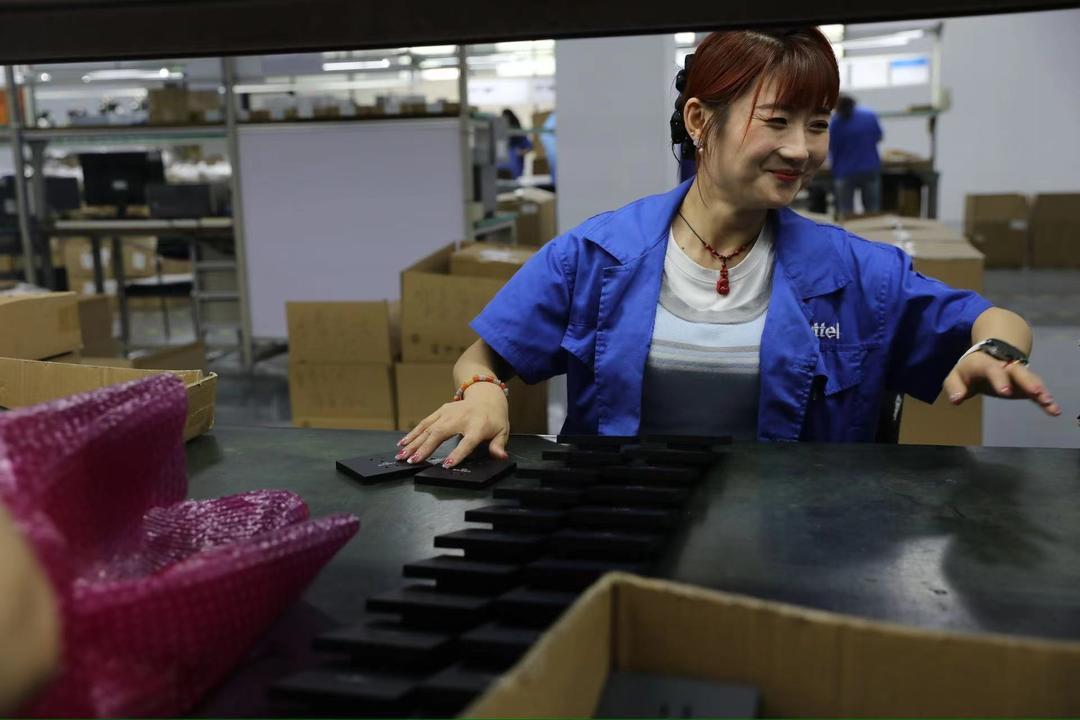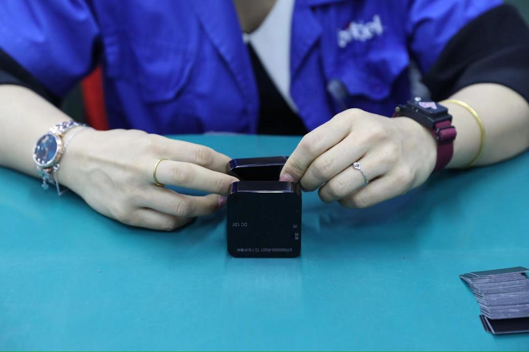 日照市东港区新旧动能转换示范基地,山东比特智能科技股份有限公司智造车间内,一名女工在组装用于通讯的红外模块。她右手腕上戴了一只漂亮的手表,左手腕上佩戴了防静电装置。她还戴了戒指、镯子,做了美甲。只要不影响正常工作,该企业允许女工的个性化装扮。
