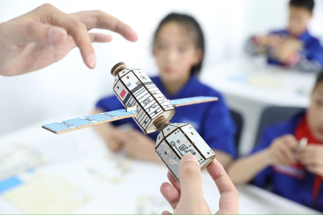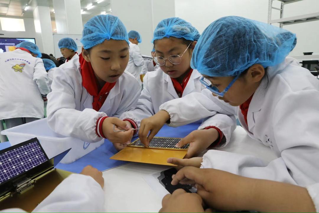 位于日照市东港区的天勰力航天科普教育基地,小学生在组装卫星模型,参加研学的女生,表现出的兴趣和干劲丝毫不逊于男同学。