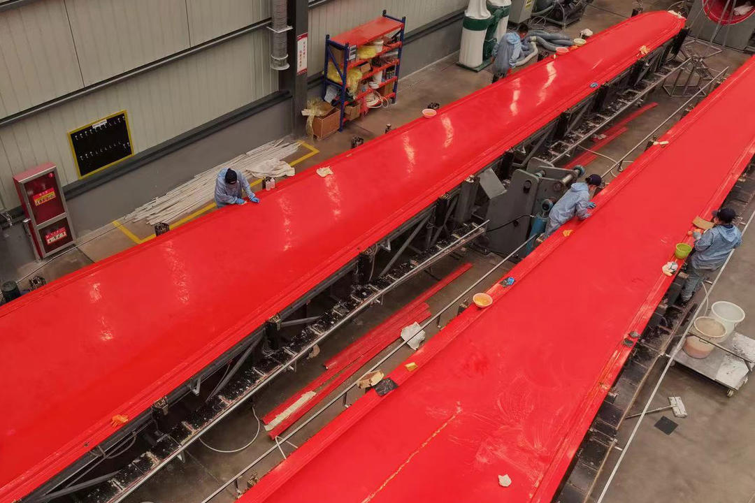 位于日照经济技术开发区的金马新能源有限公司,三名女工正在风力发电叶片生产车间作业。