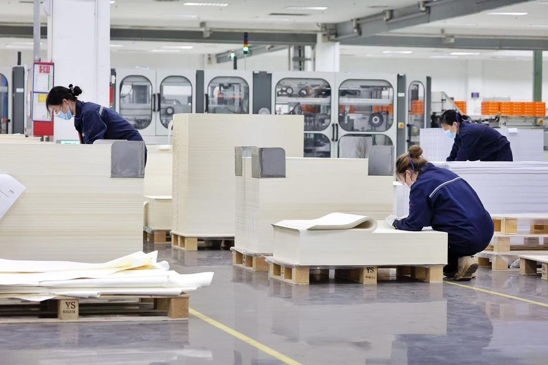 位于日照经济技术开发区的亚太森博(山东)浆纸有限公司,女工在生产车间整理检测特种纸产品。