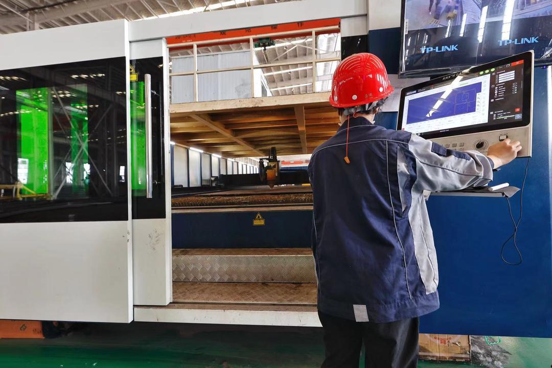 位于日照市东港区的德誉精工科技(日照)有限公司车间内,一名女技术员操作激光设备,根据客户需求,将钢板准确切割成不同规格的基础配件。