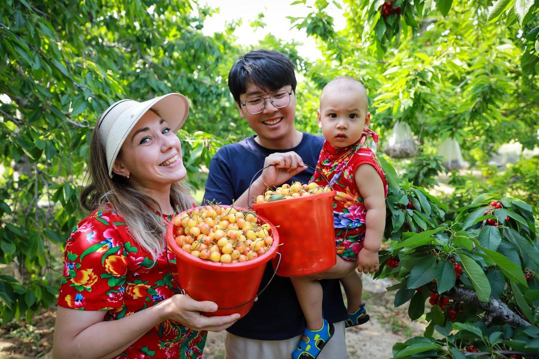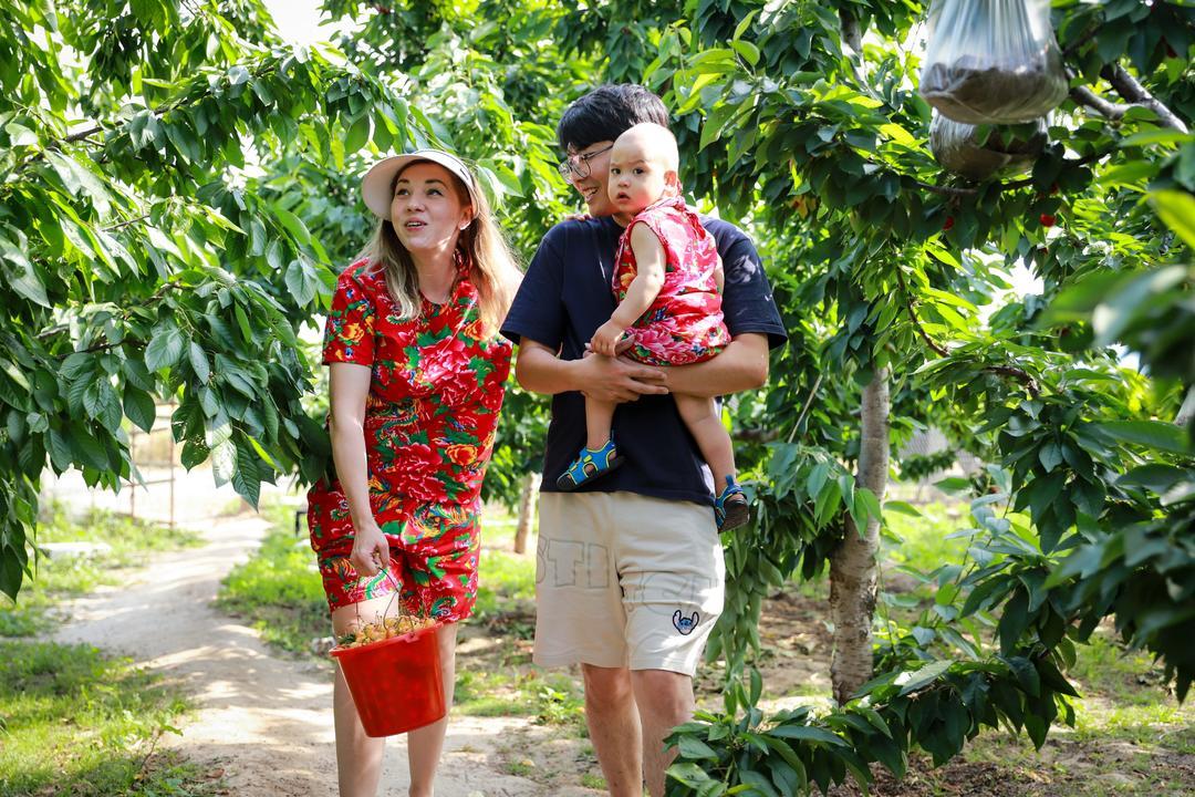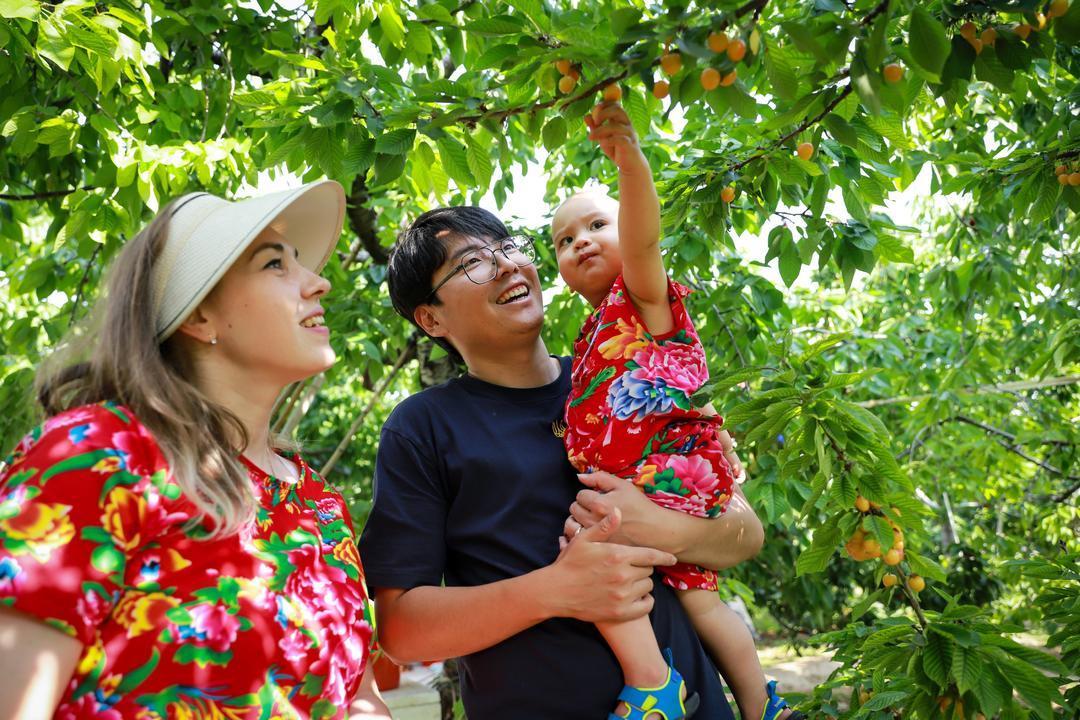 正值樱桃成熟季,范宸恺一家三口回到老家摘樱桃。