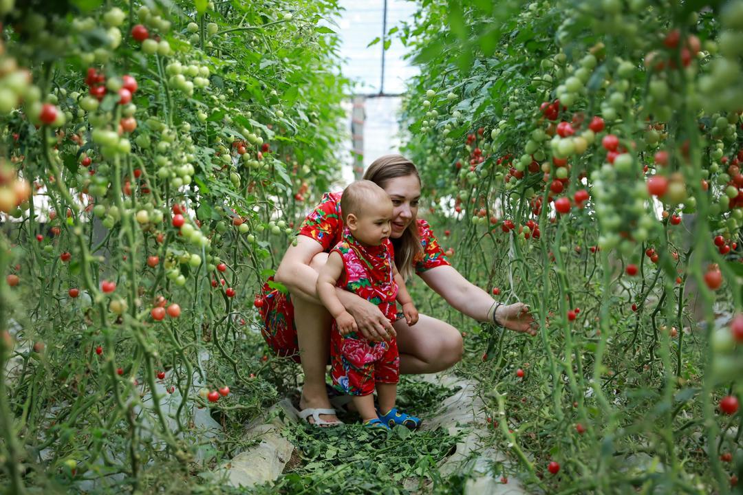 玛利亚和尼基塔在西红柿大棚里摘果子。