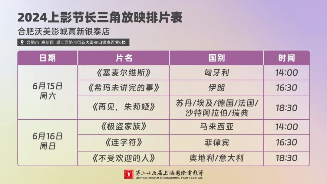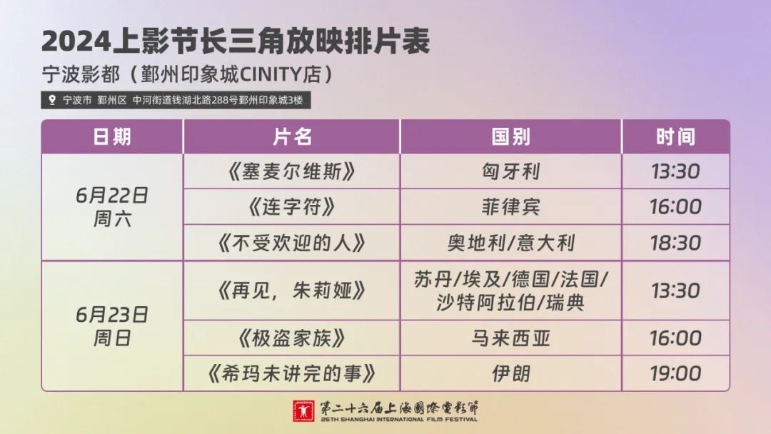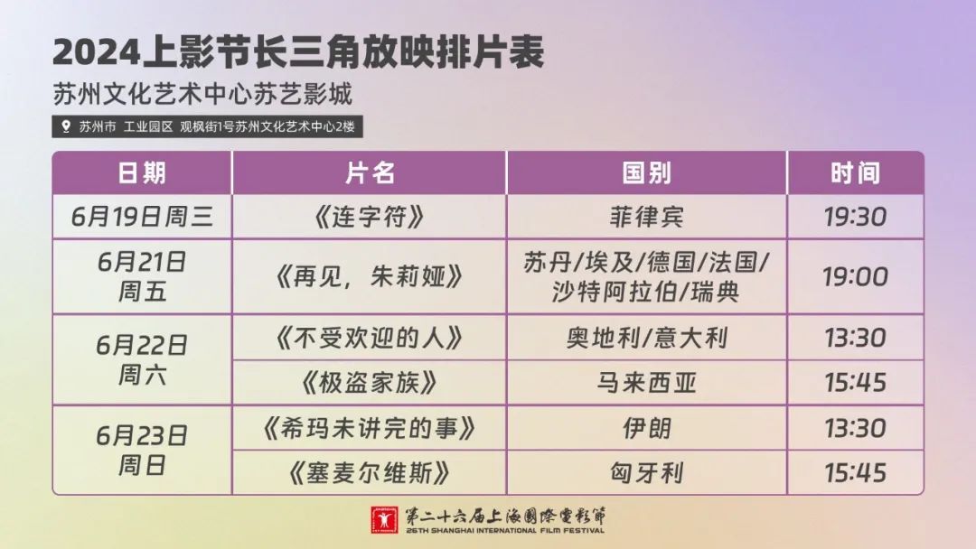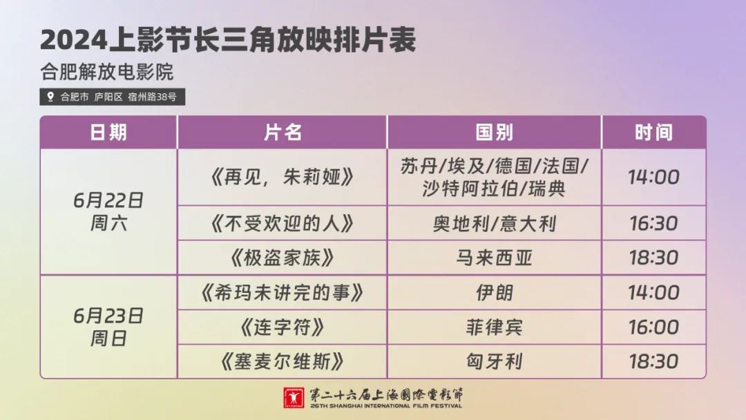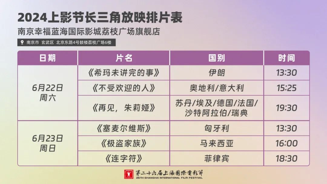 第二十六届上海国际电影节即将揭幕,长三角地区的影迷朋友们可以零时差参与这场光影盛会。6月15日至6月23日期间,南京、苏州、杭州、宁波、合肥的6家影院,展映来自“一带一路”沿线国家的6部精选影片。欢迎各地观众就近观影,在享受光影魅力同时,欣赏视角多元、层次丰富的风土人文画卷。