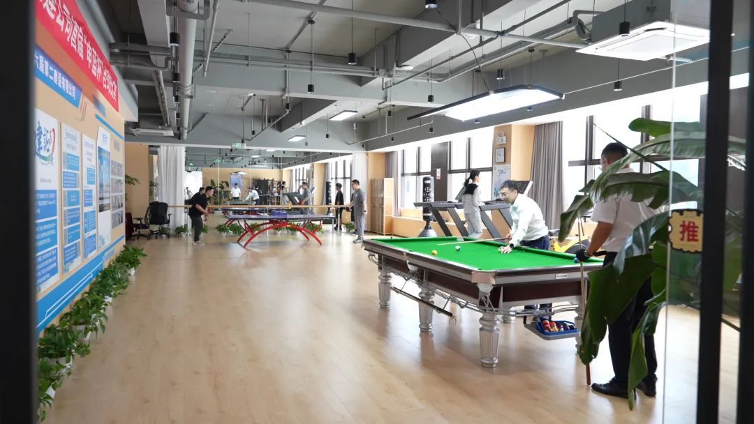 位于闵行区华漕镇的中建六局第二建设有限公司新开放的“幸福工坊”内,年轻职工们正在趁着午休时间进行放松。单打乒乓球赛况焦灼,台球车轮战让人专注,还有跑步机、综合训练器、立式拳击沙袋架等健身器材一应俱全。