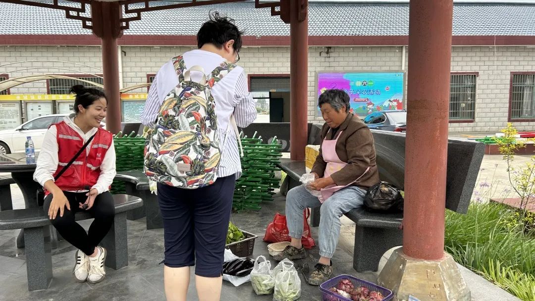 村委会的“飞鹤亭”里,村民带着自家种植的番茄、生菜、大蒜等摆摊售卖。村民董阿姨笑着说,“村里活动多了,游客也多了,我刚刚已经卖掉了3、40元(农副产品)了。”