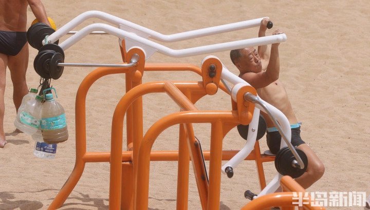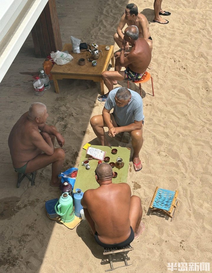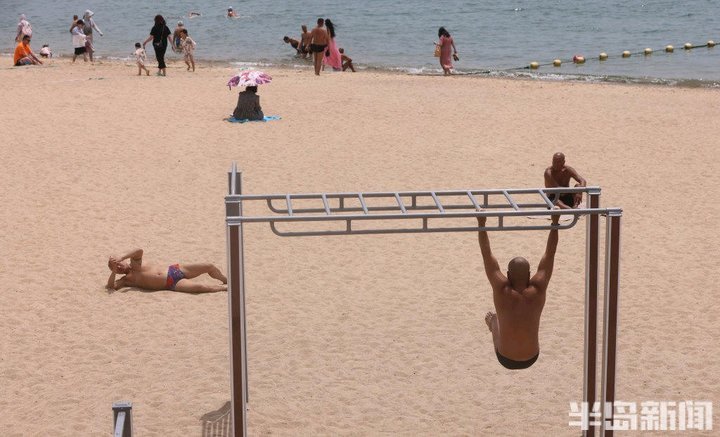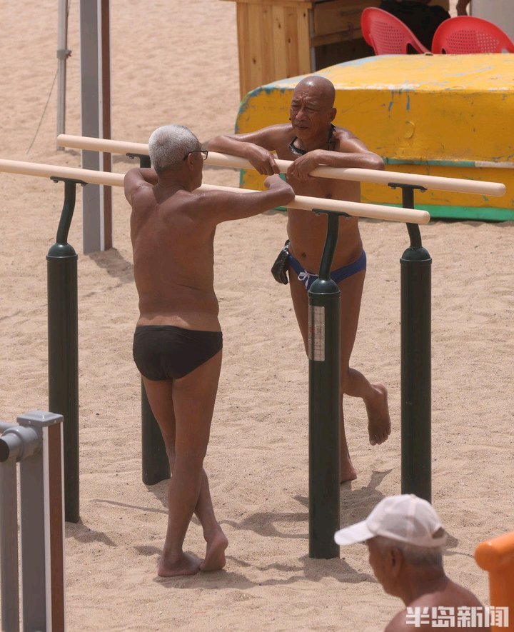 6月4日,青岛第一海水浴场沙滩上,喜好健身的大爷们或打排球、玩单双杠锻炼,或坐着马扎子与好友喝茶聊天,十分惬意。
