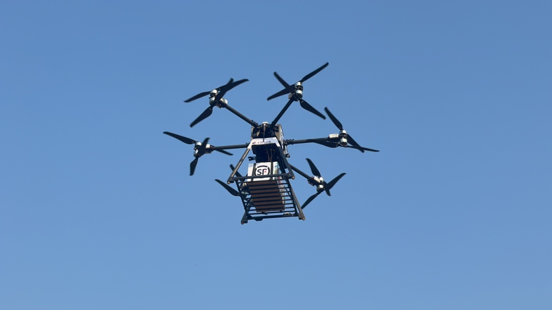 前面采摘忙,后面运得也快。当天,滨湖区无人机“快递助农”果品航线正式开通,站在老袁家的果田内,可以远远看见空中有数台大载重多旋翼无人机将包装好的醉李运送了出去。据介绍,该款无人机单次最高可运送50KG物品,巡航时速达70公里,可以保证采摘的鲜果第一时间运出来,减少损耗。
