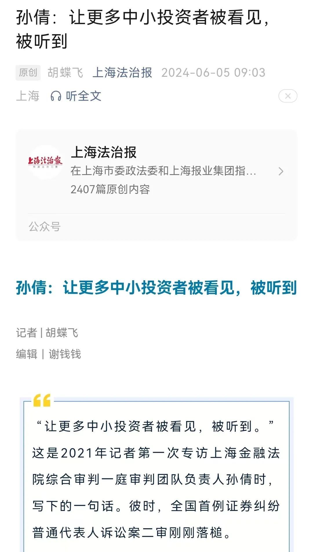 “让更多中小投资者被看见,被听到。”这是2021年记者第一次专访上海金融法院综合审判一庭审判团队负责人孙倩时,写下的一句话。彼时,全国首例证券纠纷普通代表人诉讼案二审刚刚落槌。