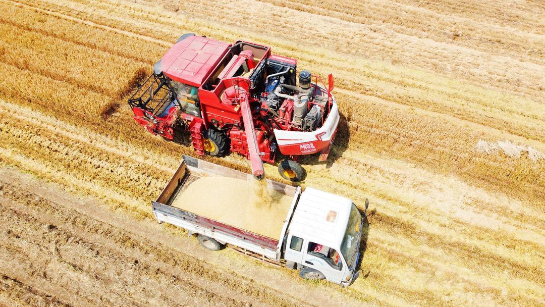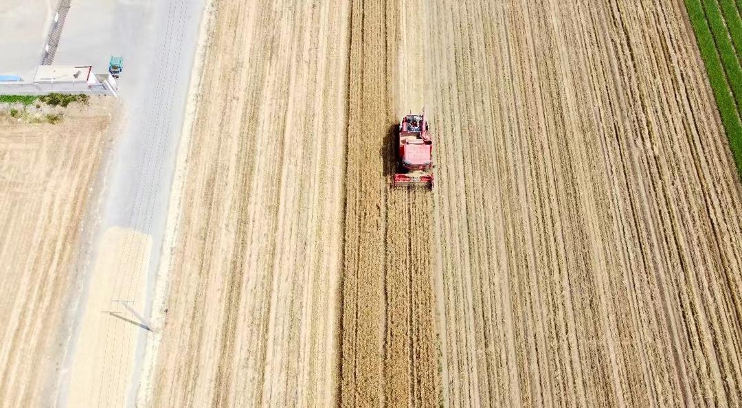 田间,机械化收割、全自动脱粒,夏收工作仿佛按下了“快进键”,伴随着收割机驶过滚滚麦田,“吞”下沉甸甸的麦穗,“吐”出金灿灿的麦粒,割麦、脱粒一气呵成。