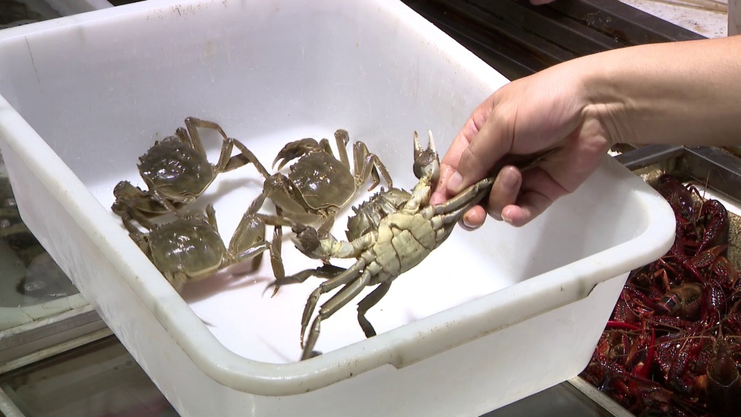 摊主告诉记者,现在的“六月黄”大都是来自江苏,由于刚上市,价格还有点偏高,再过一个星期就便宜了。“我们的‘六月黄’来自苏州东山,湖里面的蟹。”