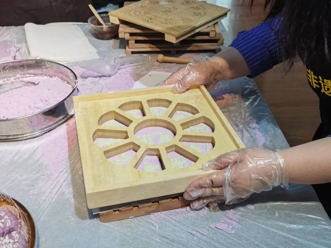 没过多久,桌上就摆满了形式各异的定胜糕,有星形的、爱心状的、叶片状的、元宝状的,样式繁多且十分精美,而这一切都归功于磨具的精雕细琢和推陈出新。“我们为了今年的高考特意重新设计了新的磨具,来展现‘金榜题名’这个主题。”磨具师傅袁佳告诉记者。他介绍,所有磨具都由传统的榫卯结构组成,通过手工对边框和底板进行画刻,紧接着再美化,才有了现在的样子。