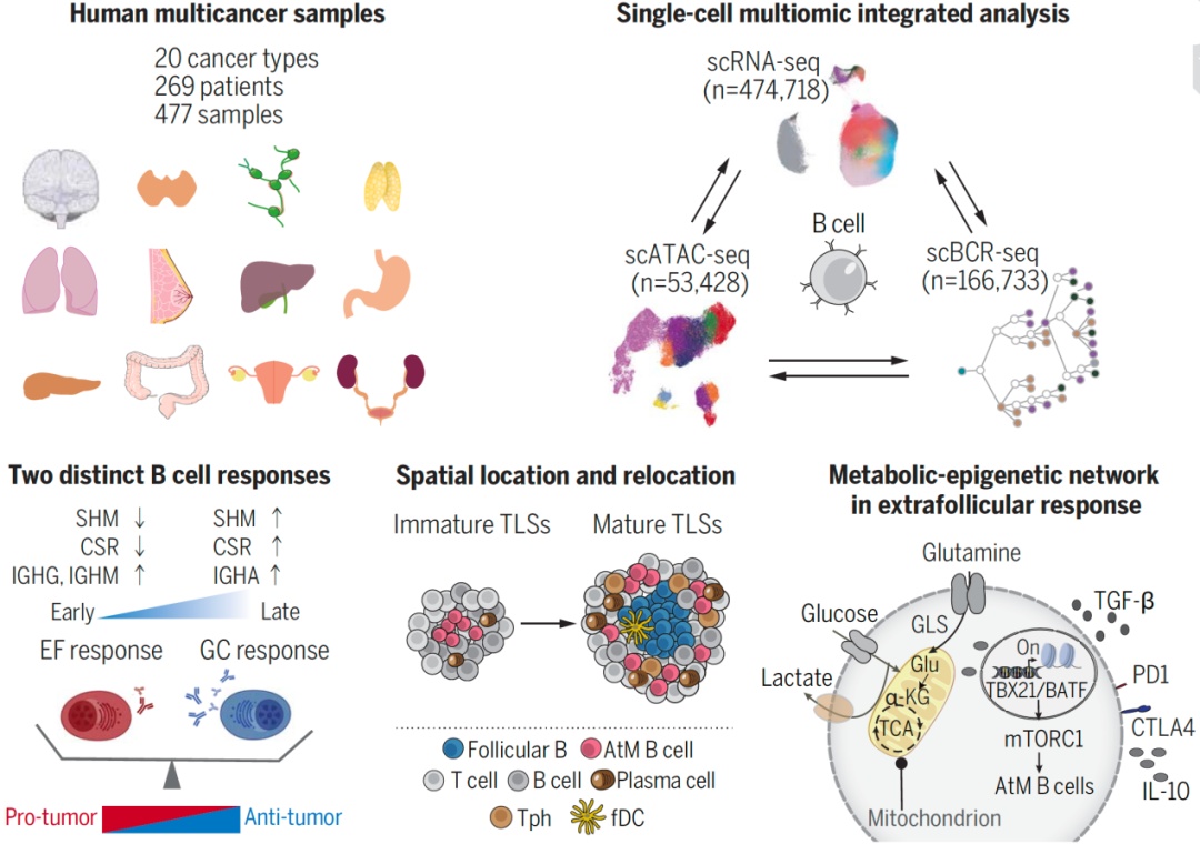 5月3日,复旦大学附属中山医院樊嘉院士、高强教授团队,联合中国科学院上海免疫与感染研究所与浙江大学基础医学院等合作单位,在《Science(科学)》杂志在线发表了题为《A blueprint for tumor-infiltrating B cells across human cancers(人类癌症中肿瘤浸润 B 细胞蓝图)》的论文,系统性揭示了肿瘤微环境B细胞的表型功能异质性、动态分化以及表观调控机制。