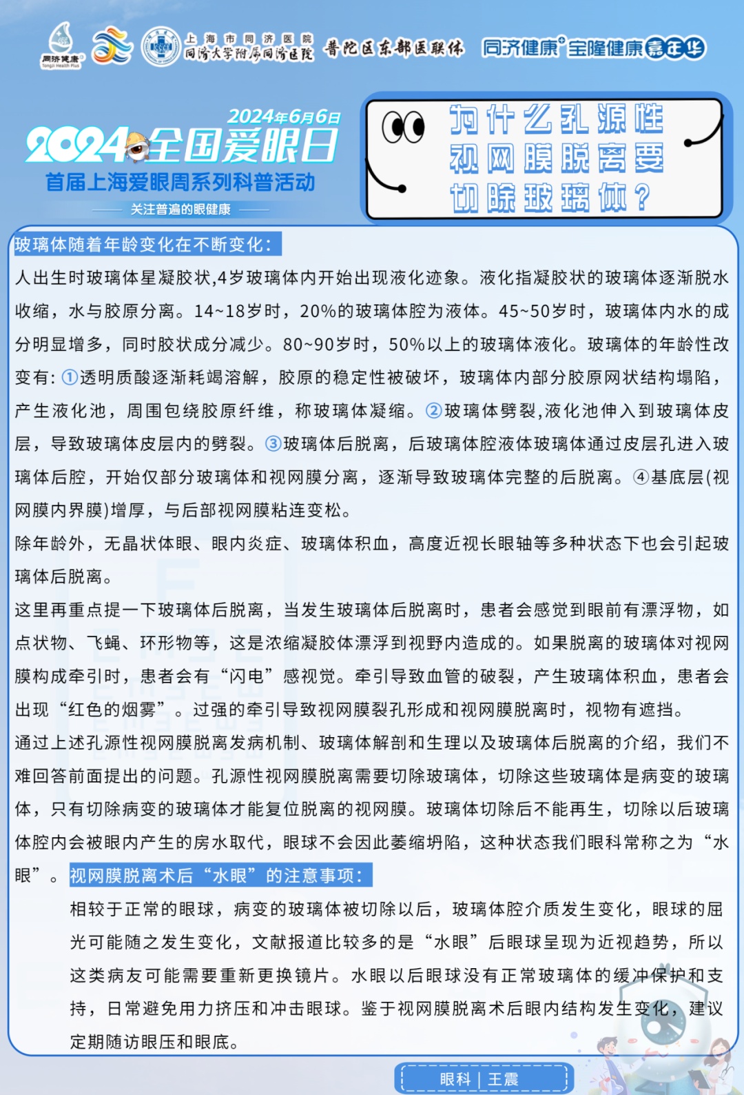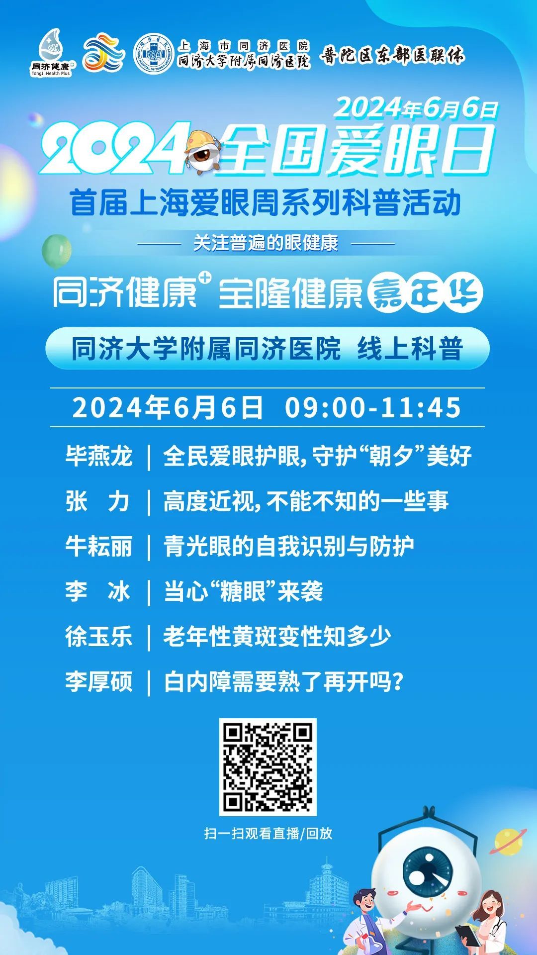 同济大学附属同济医院于2024年6月6日上午9:00进行【全国爱眼日】科普直播。来自眼科的6位专家将带来相关科普知识。让我们共同关注眼健康,享受明亮清晰的世界。