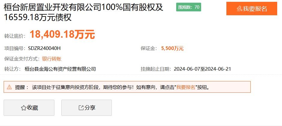 日前,桓台新居置业开发有限公司(下称“新居置业”)100%国有股权及16559.18万元债权转让项目在山东产权交易中心挂牌,挂牌公告显示,该股权的持有方为桓台县金海公有资产经营有限公司(下称“桓台金海”),转让底价为18409.18万元。若这笔交易达成,则新居置业的实际控制权将发生转移。