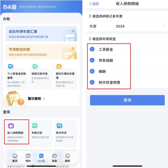 通过个税APP收入纳税明细查询可以查询到扣缴义务人已扣缴或纳税人已自行申报的工资薪金、劳务报酬、稿酬、特许权使用费,不包括经营所得哦。