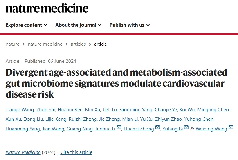 研究团队瑞金医院王卫庆教授、毕宇芳教授和王天歌研究员受邀于《自然-医学》(Nature Medicine)发表题为“Gut microbial age modulates cardiovascular disease risk in metabolically unhealthy older people”的Research Briefing专栏文章,重点推介科学问题、主要发现和临床意义,以及研究背后的心路历程和未来展望:“我们的研究结果揭示了肠道菌龄对代谢紊乱的老年人群心血管疾病风险具有显著调节作用,独立于宿主年龄与多种环境因素,为继续探索特定微生物特征的机制和更广泛应用奠定了基础。我们希望通过持续的研究,解析肠道微生物与宿主年龄和代谢之间的相互作用以何种模式影响心血管健康和死亡,从而更深入理解复杂的代谢衰老-微生物关系,并制定干预措施以促进健康老龄。”