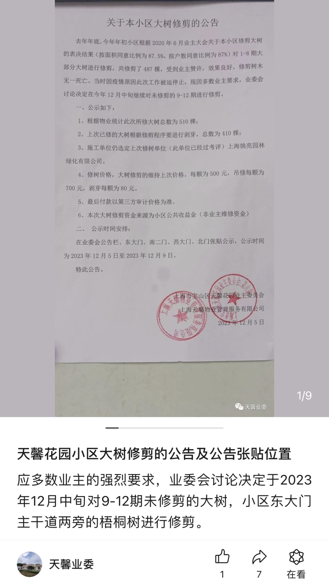 “树枝修剪后,小区采光好了很多,嫩绿的春芽冒出,小区环境更美了”这是宝山区杨行镇天馨花园小区居民近期热议的话题。 天馨二居党总支积极为民办实事,着力解决人民群众急难愁盼问题,“四百”大走访进的是家门,“近”的是距离。 党建引领解难题 天馨花园小区自1997年滚动开发,总占地面积36万平方米,绿化覆盖率40%以上,随着树木枝叶越来越茂盛,不仅滋生虫蚁,还影响采光通风,有些树木长势过高,刮风下雨还会存在树枝刮落、树叶堵塞下水道的隐患,居民对于树木修剪的意愿一年比一年强烈。 早前在多方努力下,社区启动大树回缩修剪工程,先后修剪了487棵大树,但由于体量较大,修树事宜暂缓搁置。 去年秋季,社区在走访中收到较多居民的意见反馈,希望能继续推进修树工程。党总支高度重视,将全面大树回缩修剪作为社区民生实事项目的重点工作,牵头各部门共同推进解决这一难题。 议事协商同齐心 “三驾马车”多次实地查看小区各处,先后召开“议事9吧”居民联席会议,讨论修树相关方案,并向居民征询修剪高大树木的意见建议。 业委会负责把好账目关,居委做好居民协调工作,物业做好现场车辆的调配,在多次与业主沟通协商后最终确定了高大树木的修剪方案。 居委与物业发动志愿者、楼组长等提前进行宣传,最大程度争取居民的支持与配合,业委于线上及宣传栏张贴公告后,得到居民们的大力支持。 群众参与聚合力 去年冬天,修剪工程全面启动。本次修剪不仅工作量大,要修剪510棵树木,部分狭窄的小区道路也极大地增加了作业难度。 物业、居委及管理部门全程跟踪、积极配合,工作人员对修剪下来的树枝及周边落叶、垃圾等及时清理,确保行人、车辆的安全通行不受影响。现场更是有居民志愿者们主动维护秩序,第一时间与施工方沟通,确保修剪到位。 回缩修剪完成后,长势杂乱的树木“旧貌换新颜”,影响室内采光的大部分树木得到了修整,有效改善了小区环境,也消除了安全隐患。随着“烦心树”被修剪,“烦心事”得以化解,居民们脸上显露出笑容。 修剪后的几月,春芽新冒,绿意清爽。“人民城市人民建,人民城市为人民”,小区绿化关乎居民的生活品质,也关乎居民的生命财产安全,社区应民所求,急民所需,修剪树木还居民一片清爽环境,不断提高社区居民的幸福感、满足感和安全感。