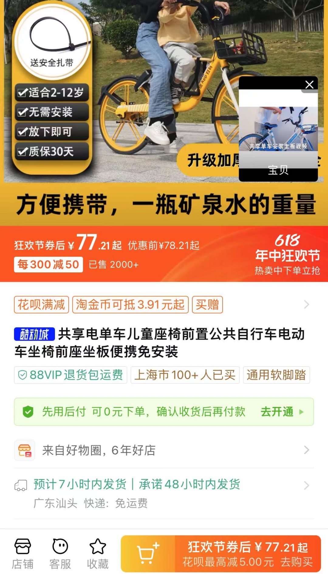 以“共享单车儿童座椅”为关键词在电商平台搜索发现,产品众多,售价从几十元到百余元不等。其中,销量最多的“座椅”其实是一根带有卡扣的“横梁”,两边用带子挂着“脚踏”。