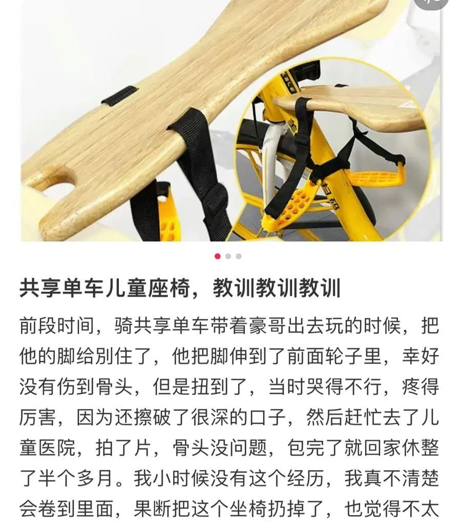 记者发现,整个“座椅”没有任何加固措施,也没有扶手和安全带,“脚踏”紧挨着前轮。有使用过该产品的家长承认:“确实危险,一直提醒孩子不要把脚伸进车轮。”但该家长又说,“为了赶时间,只能将就了。”在社交平台上,也有家长发布“教训帖”,表示使用“共享单车儿童座椅”后,孩子受伤了。