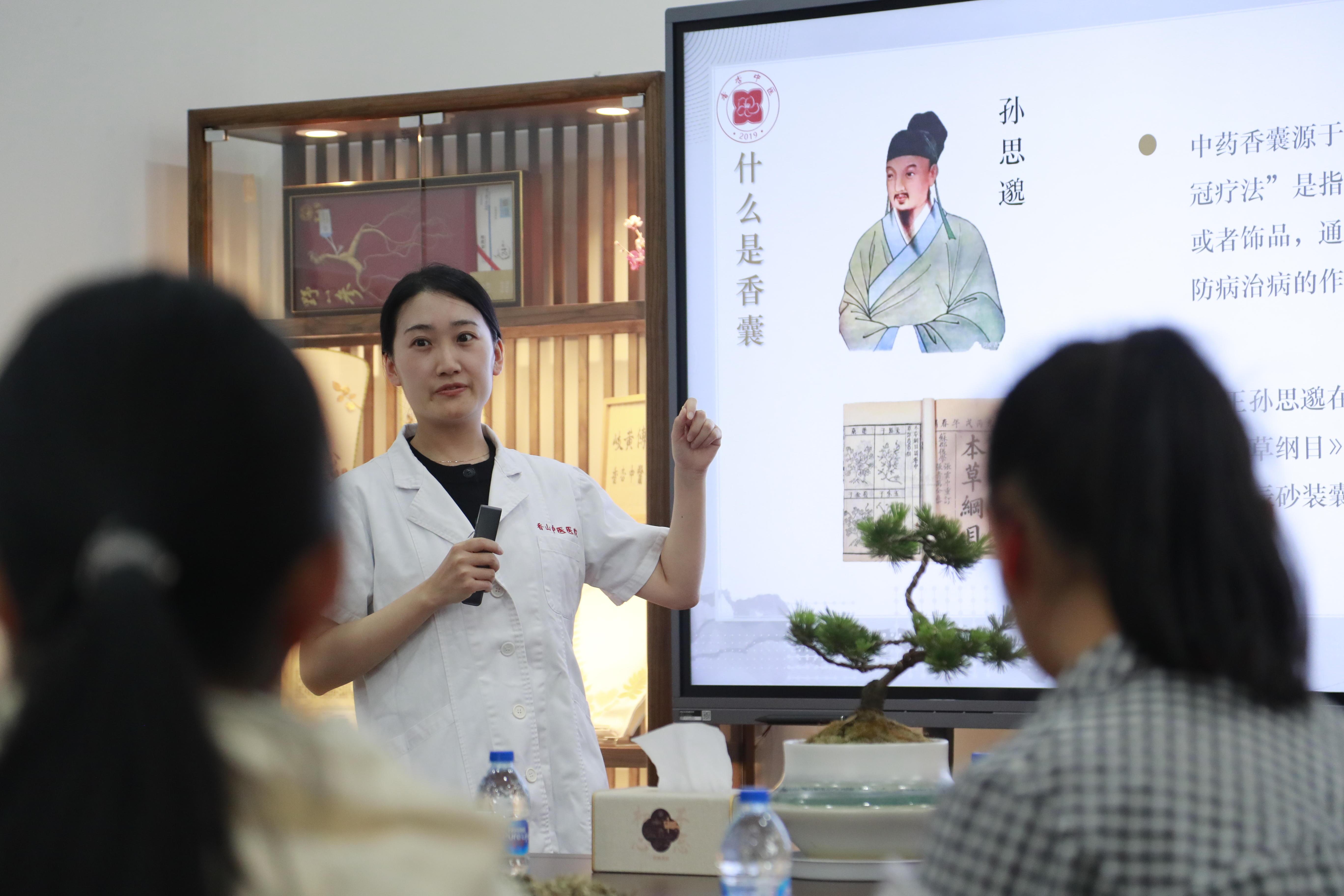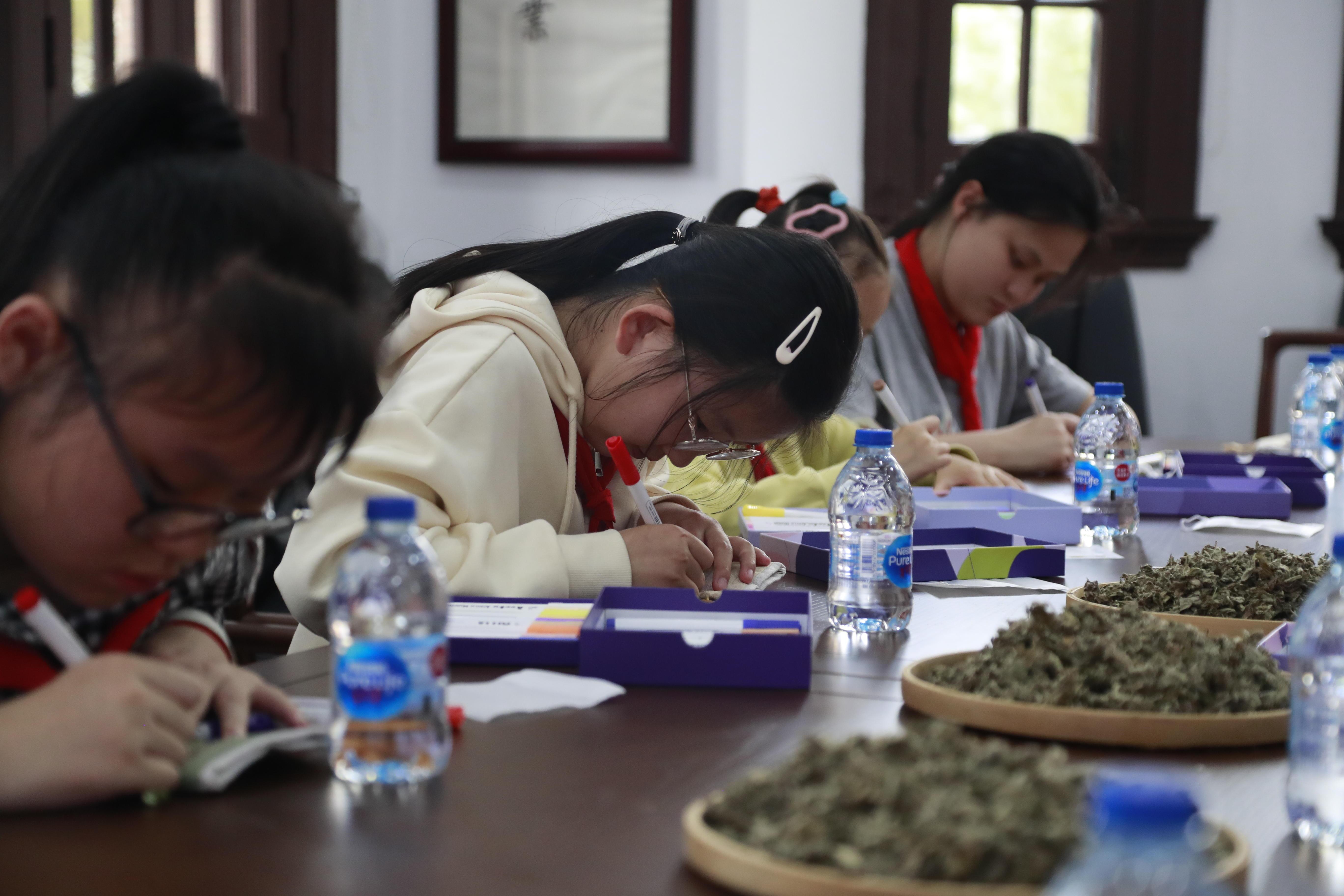 在这里,孩子们不仅通过一系列看、闻、摸、掂以及亲手涂鸦绘制,制作出了专属自己“限定款”的香囊,直观地与中药来了一次“亲密接触”,更是在不知不觉中走近中医药、了解中医药。