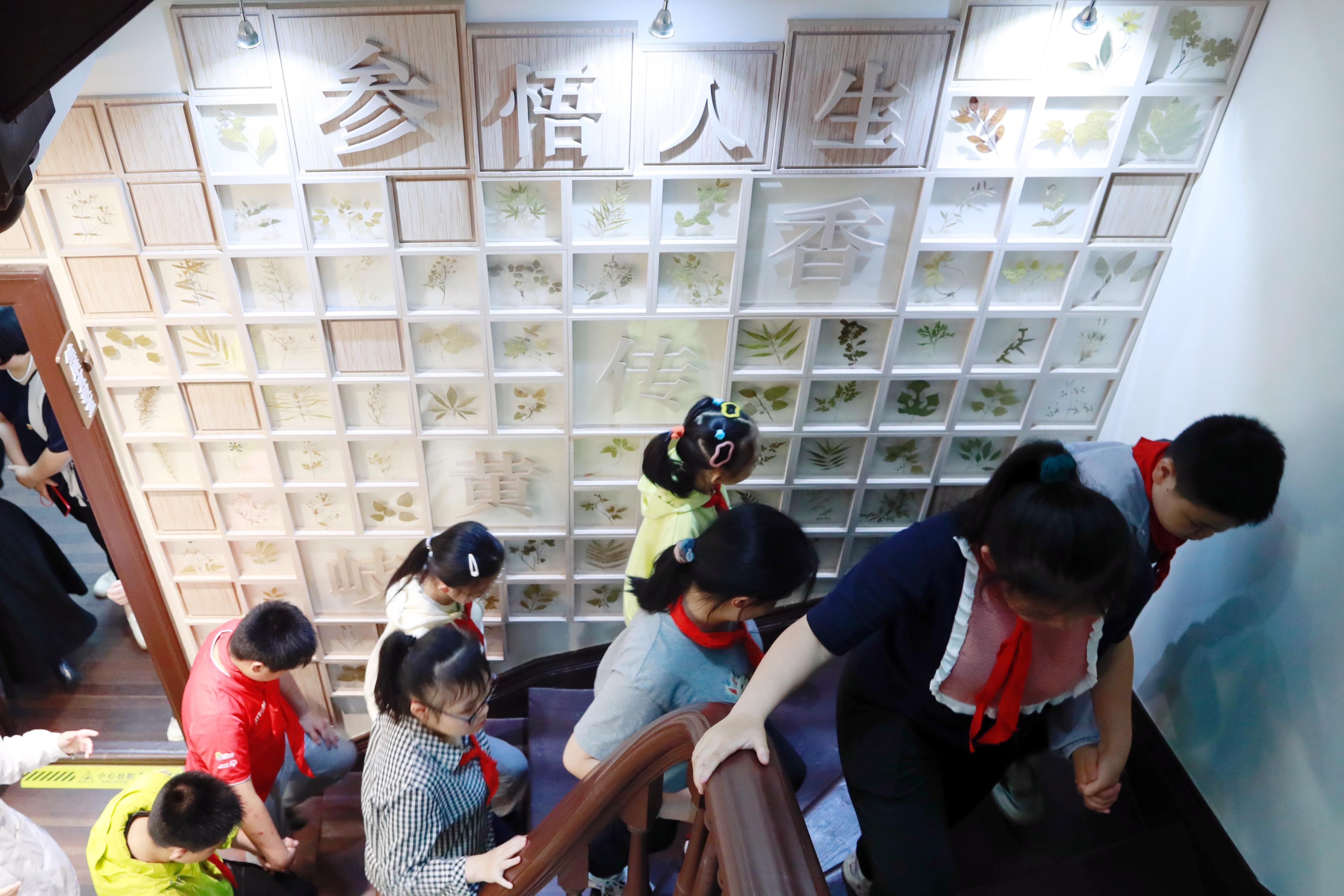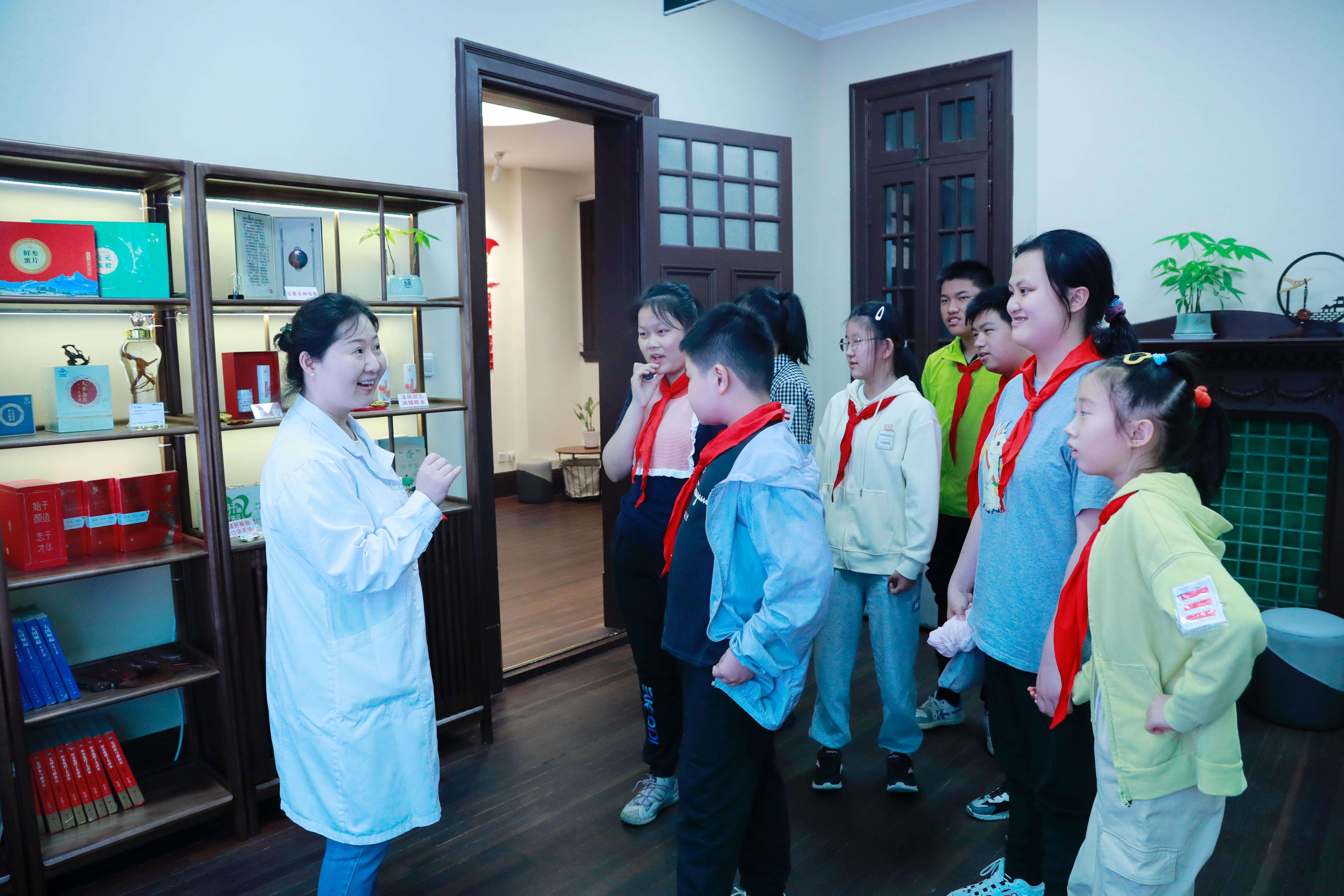 孩子们参观了中医药展览区,浏览了各家中医流派的文创产品,听专家讲解黄浦海派中医流派百花齐放的历史发展,也在国家级非物质文化遗产施氏伤科文化展示厅里,细细观赏了伤科八大家之一的“施氏伤科”的名医手稿、药物标本、名家书画等珍贵的展品。