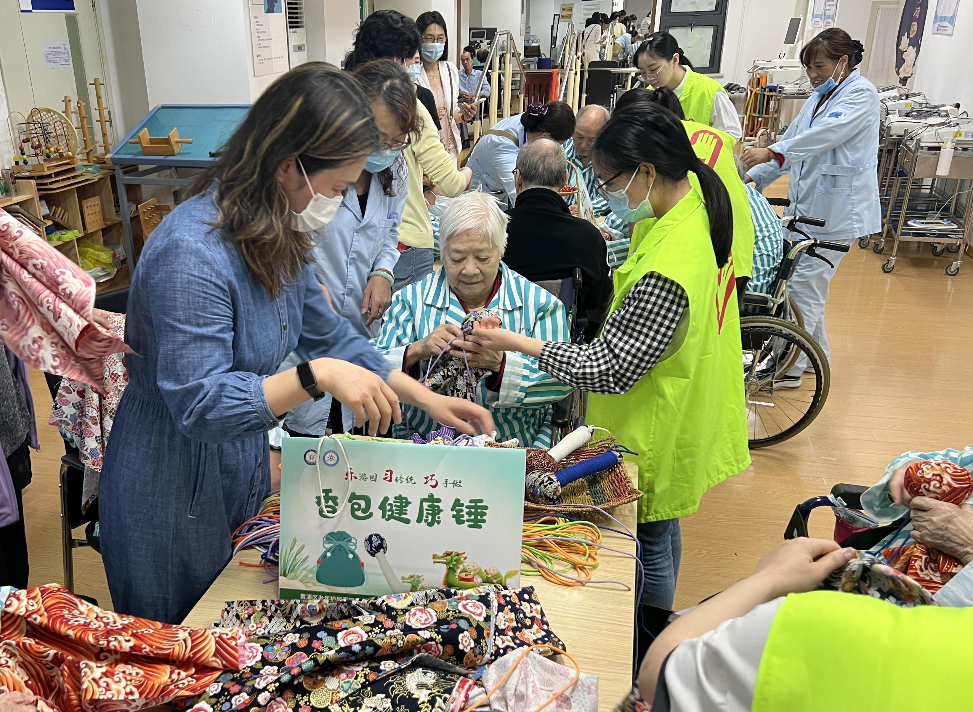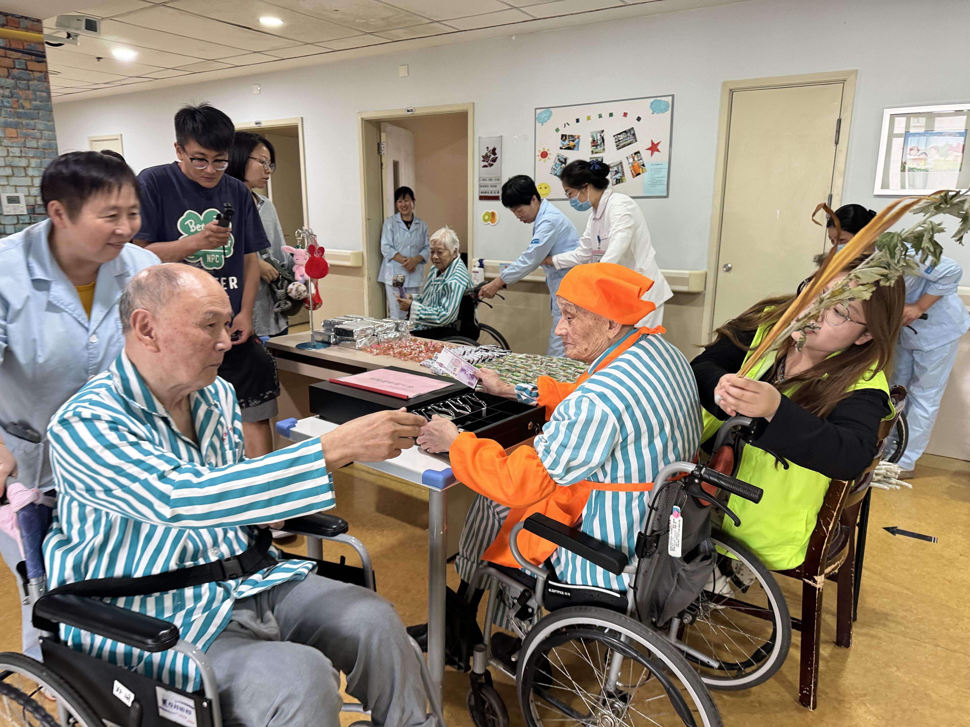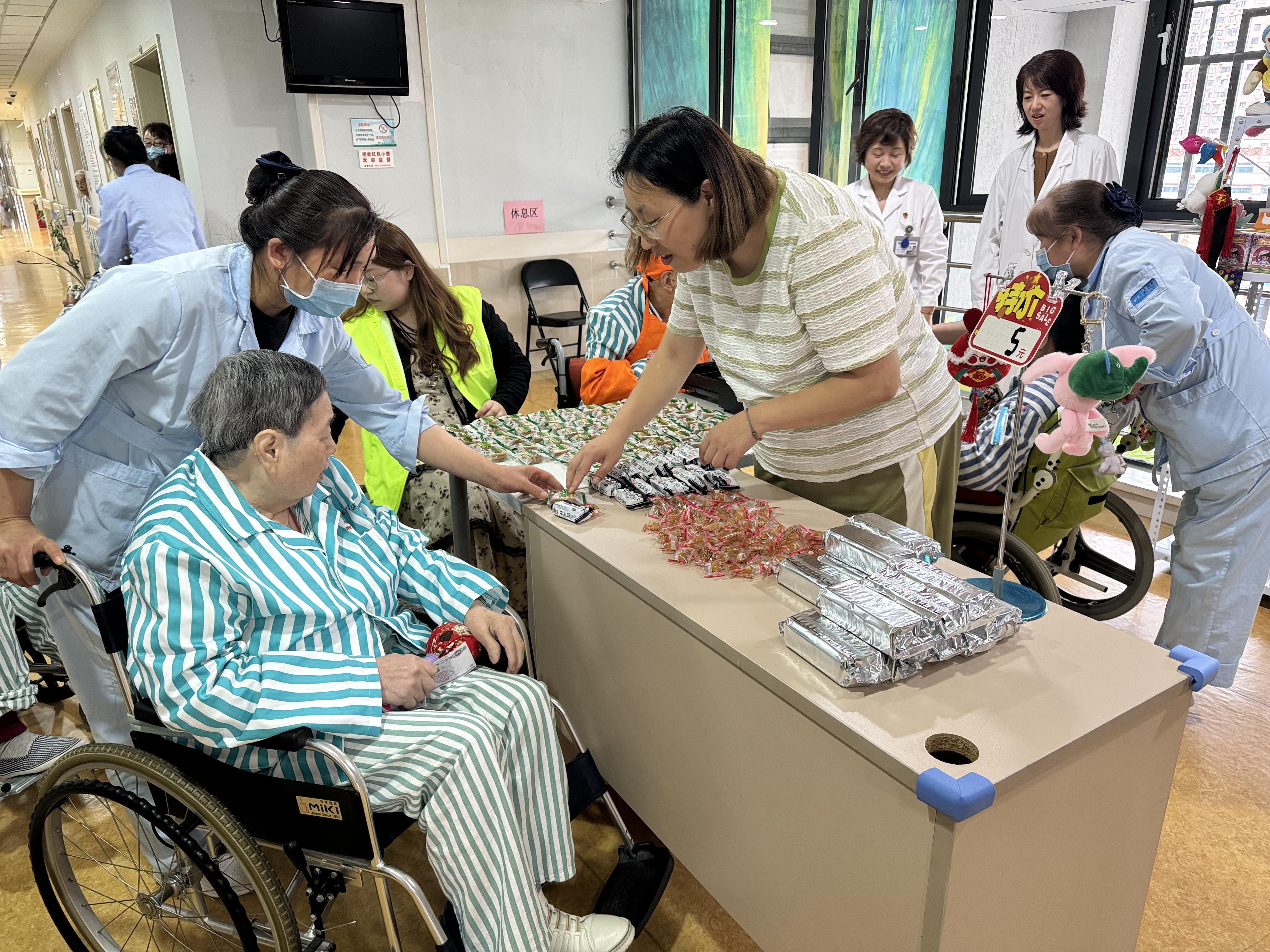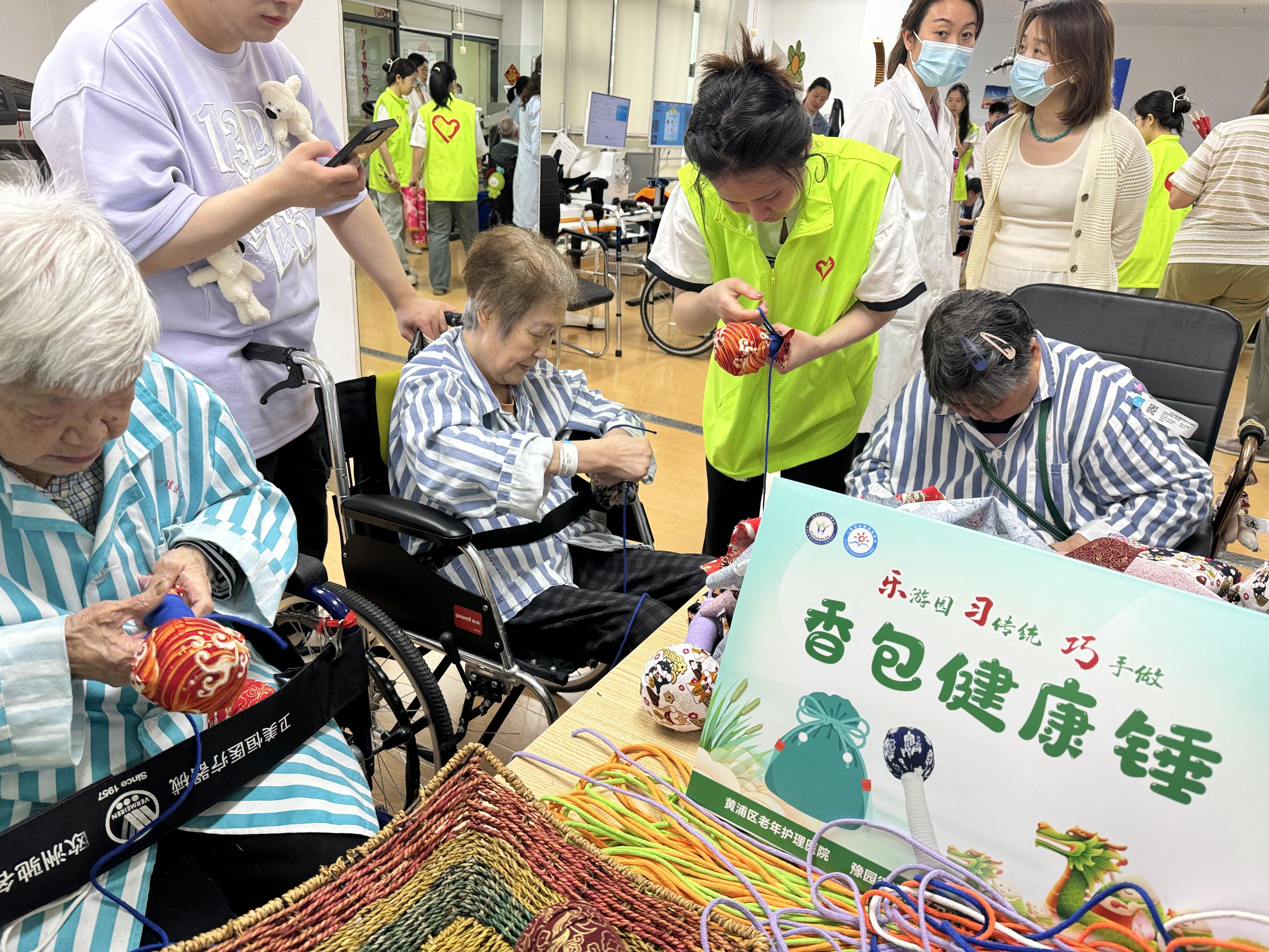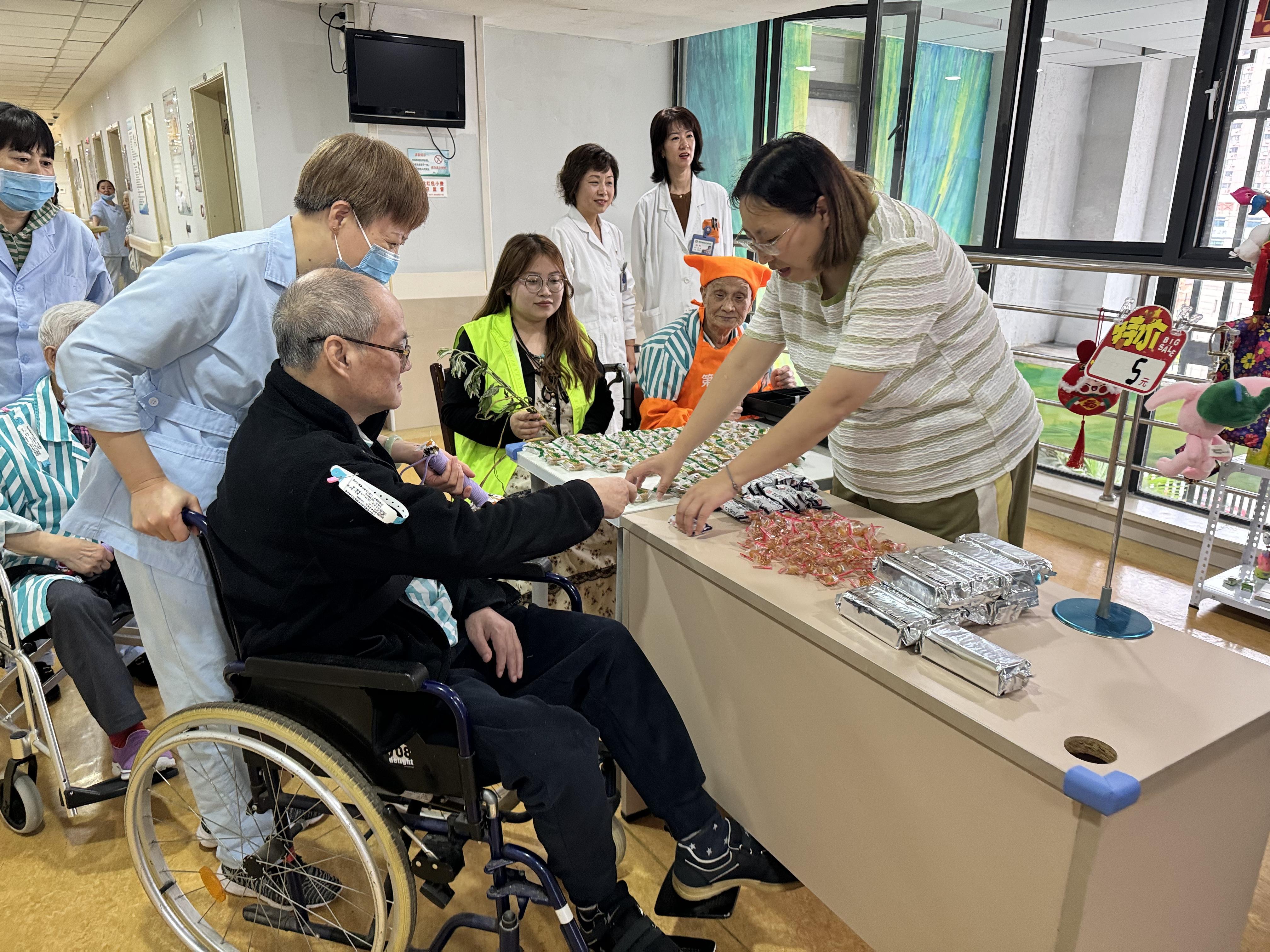 随着端午节的临近,黄浦区老年护理医院举办了一场别开生面的主题活动,来自上海中医药大学、上海市光明初级中学、上海市社会科学院的志愿者们为住院的老人们带来了一场充满欢声笑语的节日盛宴。老人们纷纷走出病房,参与到这场富有传统文化气息和创意的活动中,仿佛回到了年轻时的欢乐时光。