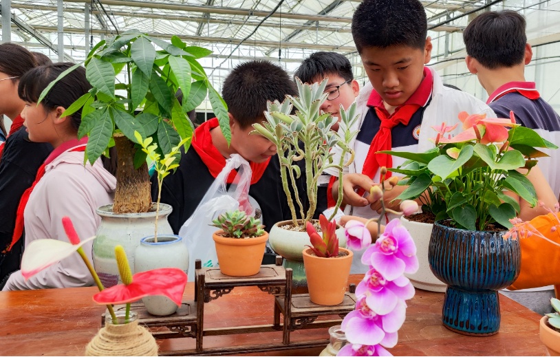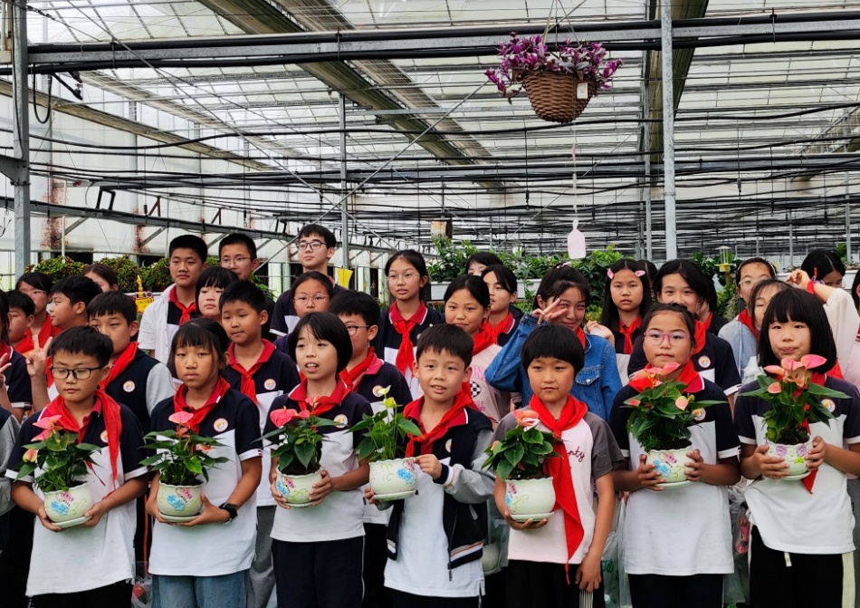 在种植红掌花的温室花棚内,规模化的种植让孩子们不禁发出了“哇”的感叹声。瀛庙果蔬专业合作社理事长任小平介绍,目前合作社深度结合人工智能、物联网等新一代信息技术与智慧温室的花卉种植,打造了集硬件、AIoT技术、种植技术、销售渠道为一体的智慧农业整体解决方案,在种植红掌花等花卉的过程中运用大数据分析来了解花卉生长所需的气候环境、生态环境以及温度、湿度和营养,精准制定花卉种植标准,让花卉生长得更好。