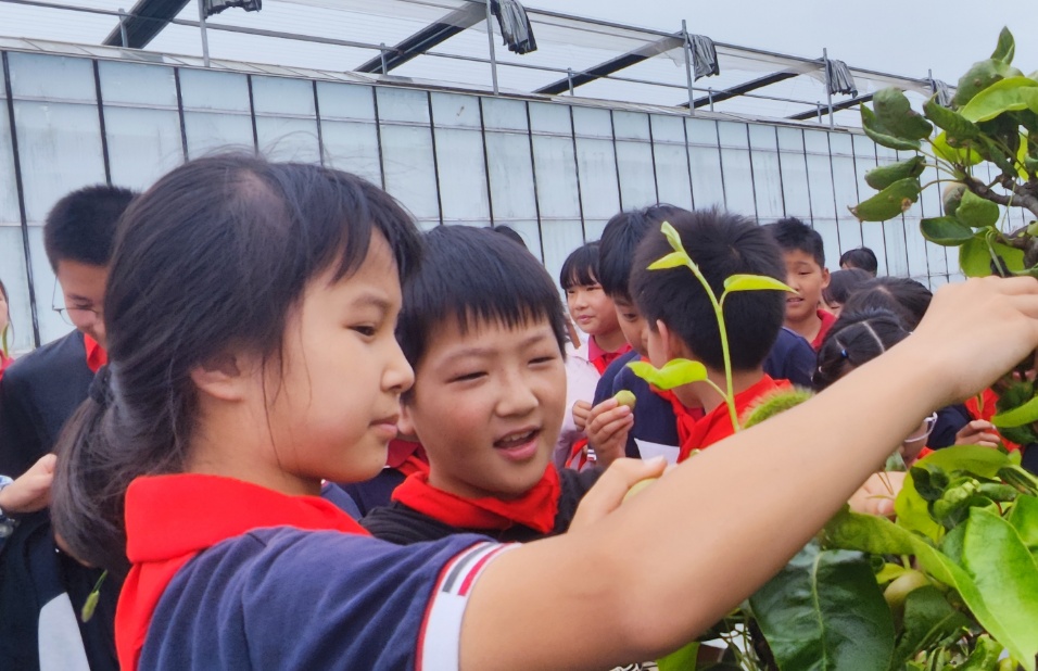 下午1点,瀛庙果蔬专业合作社的工作人员带领师生参观数智生态花卉产业园,工作人员化身讲解员,为小朋友们介绍了各种果蔬和花卉的名称和特点。“这种植物叫辣椒,我奶奶家种了”“这个是梨树,上面长了好多小梨”……孩子们一个个热情高涨,还有小朋友在经过工作人员的允许后,摘下梨子尝了一口。